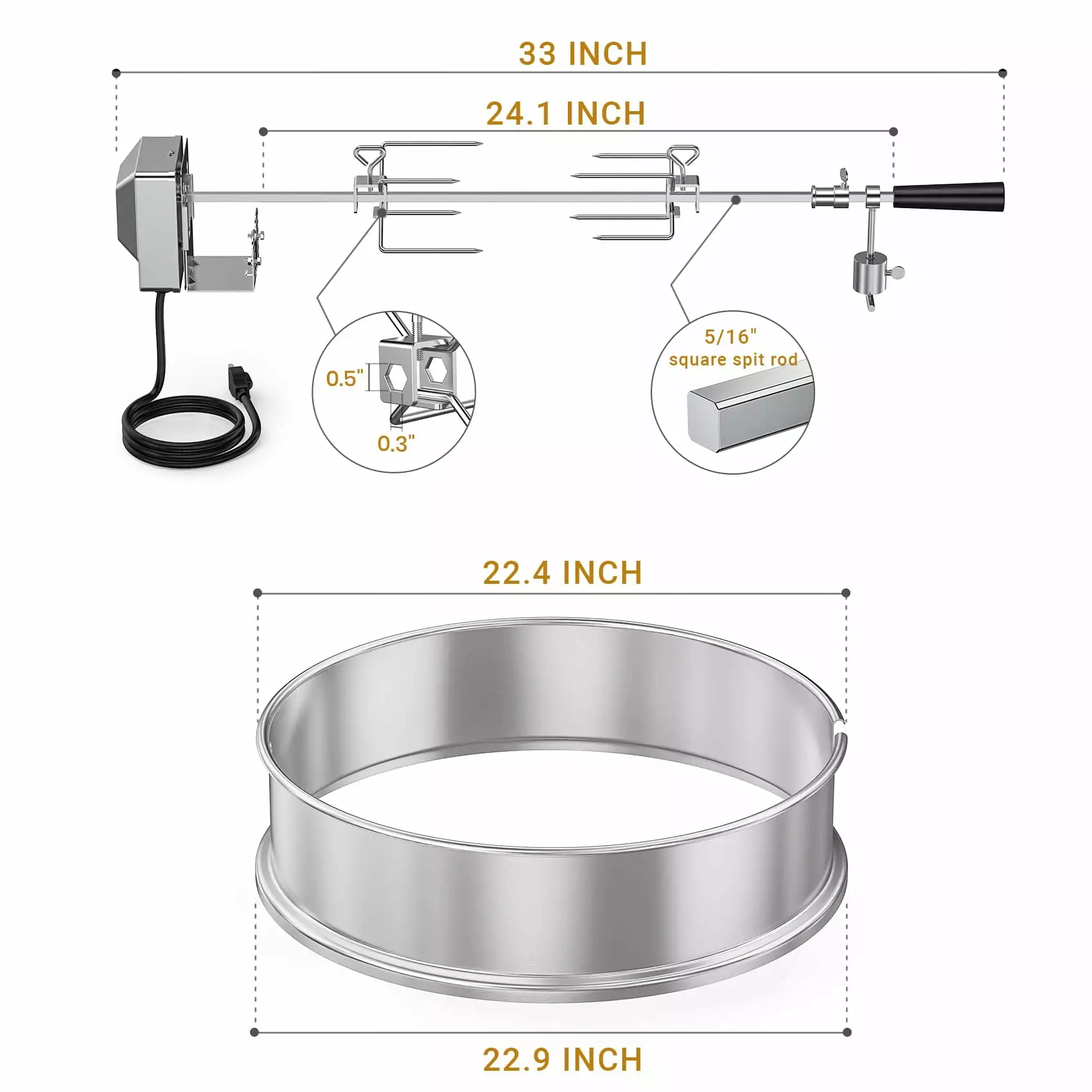 - Package Includes 1*main ring. 1*standard 5/16 stainless steel square spit rod. 1*electric motor. 1*motor bracket. 1*counter balance and bushing kit. 2*4-prong stainless steel meat forks and 1 handle.