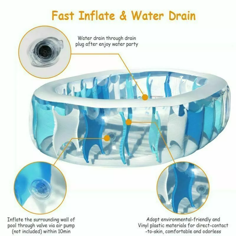 *PREMIUM MATERIALS & STRONG STRUCTURE:Adopt environmental-friendly. and ultra-high standard Vinyl plastic materials for direct-contact-to-skin products with .19mm thickness.reducing the risk of punctures and ensuring a long service life. *FAST WATER DRAIN & FOLDABLE:Inbuilt with a drain plug at the bottom of swimming pool.drain water within several minutes. Deflate the swimming pool and clean via tidy cloth mopping. Fold to store when not in use. 40Gallon water contain while recommended to refill 80% water.
