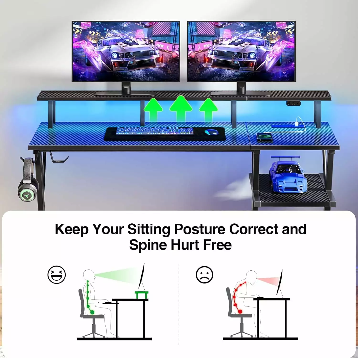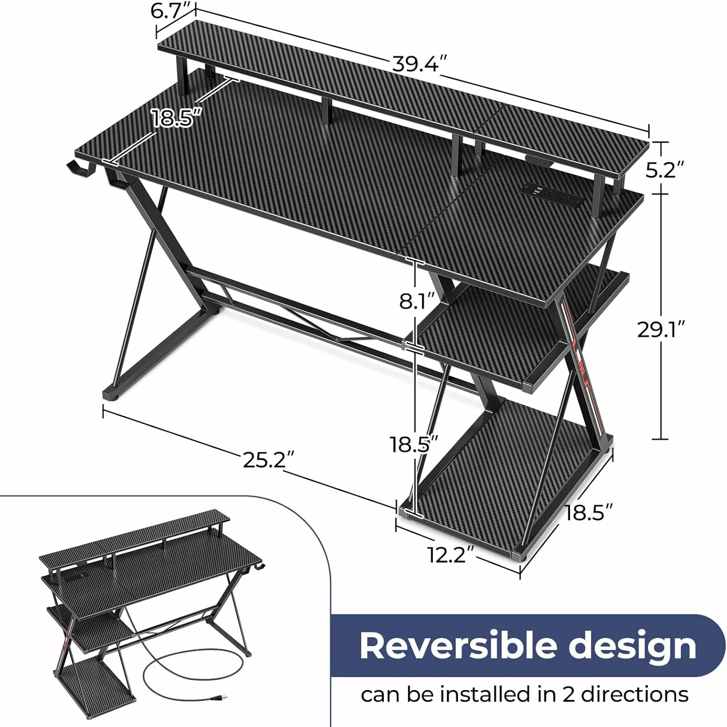Gaming Desk with LED Lights & Power Outlets. 39 Computer Desk with Monitor Stand & Storage Shelf. Gaming Table with Earphone Hook. Office Desk with Footrest. Carbon Fiber Black