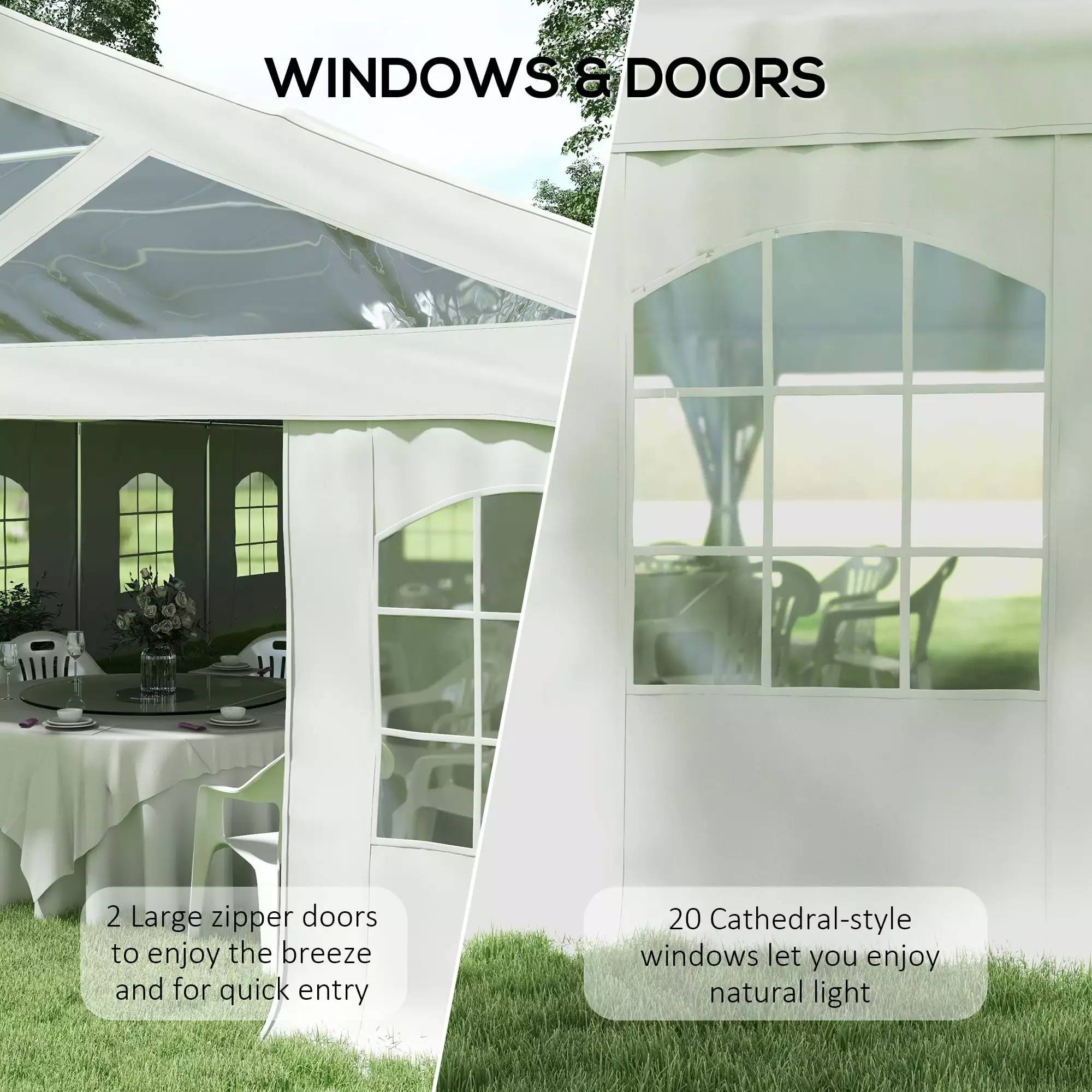 Outsunny’s extra large canopy tent with sidewalls can set up a shelter for various events. Excellent for wedding receptions. graduation parties. or barbeques. it offers 20 stylish cathedral-esque windows. These windows. together with its tent top. provide a cool and comfortable space underneath that keeps out UV and is sunburn-free. Fit up to 48 guests and enjoy a soothing breeze with the ease of two zipper doors. With strong steel and superior style. the party is on with Outsunny.With Removable Sidewalls