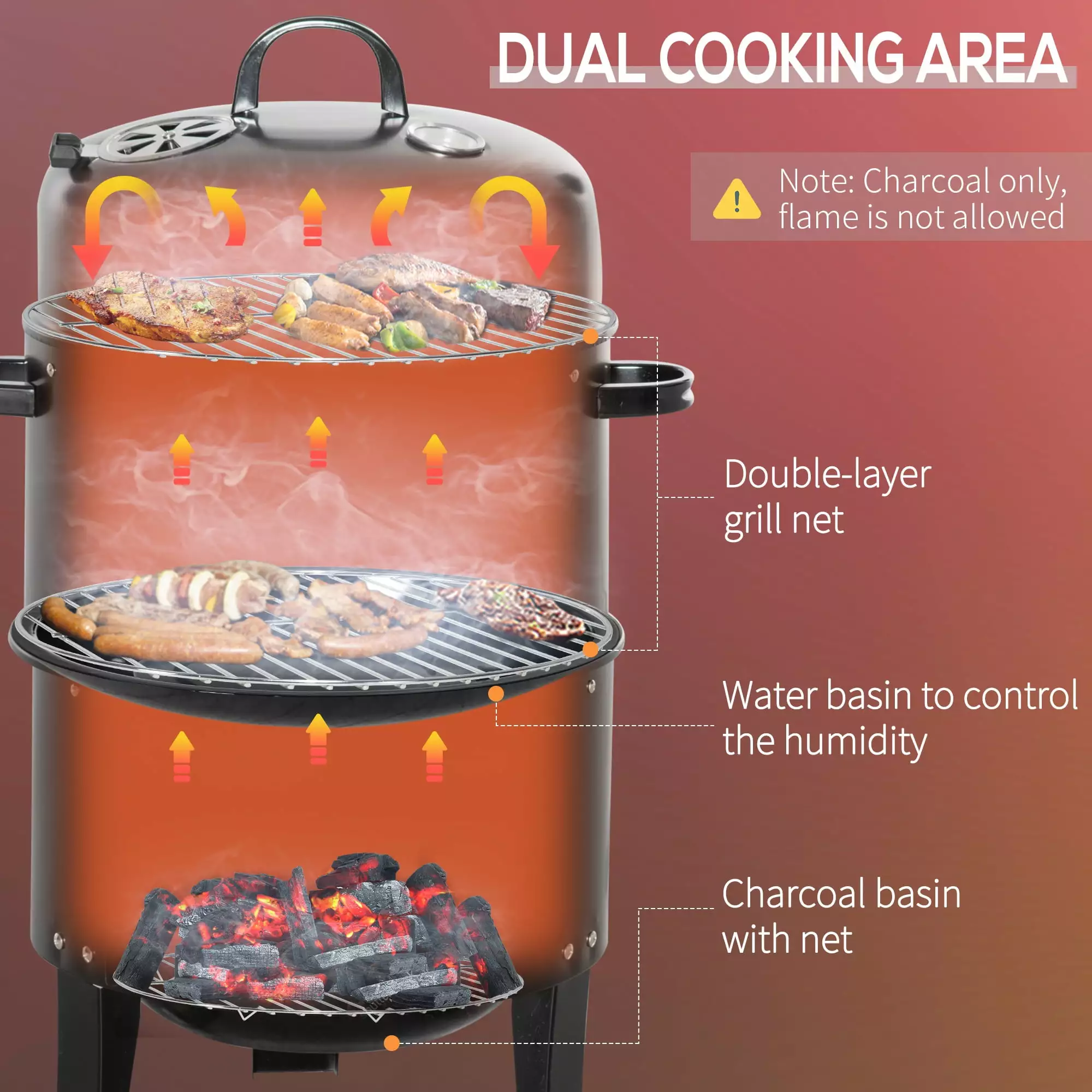 - Dual Cooking Design: This BBQ smoker has two layers you can cook on. so it cuts your meal cooking time in half. Cook your meats on a level and sides on another so everything gets cooked together. The bottom level allows you to put your favorite charcoal or wood chips inside to create the best flavors.