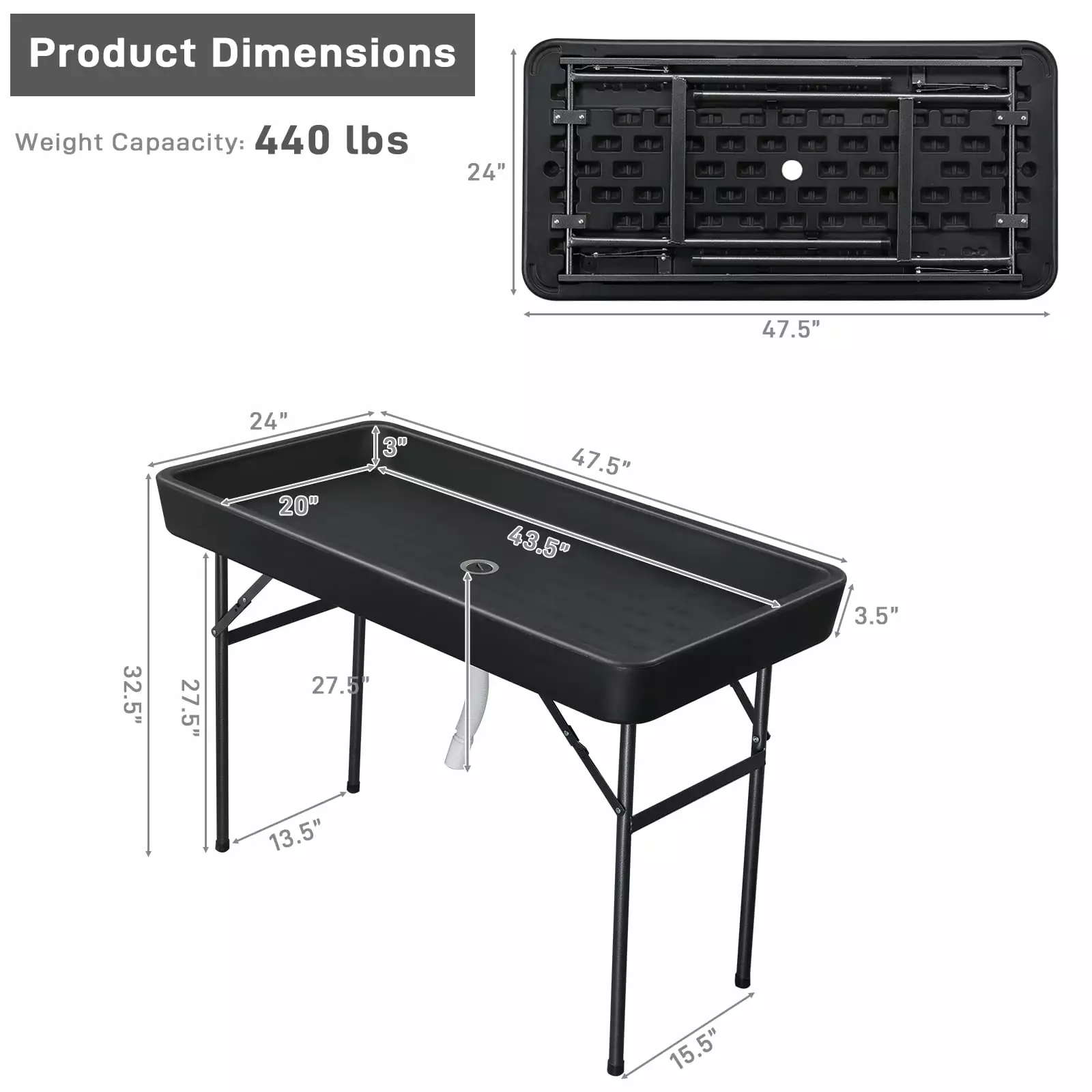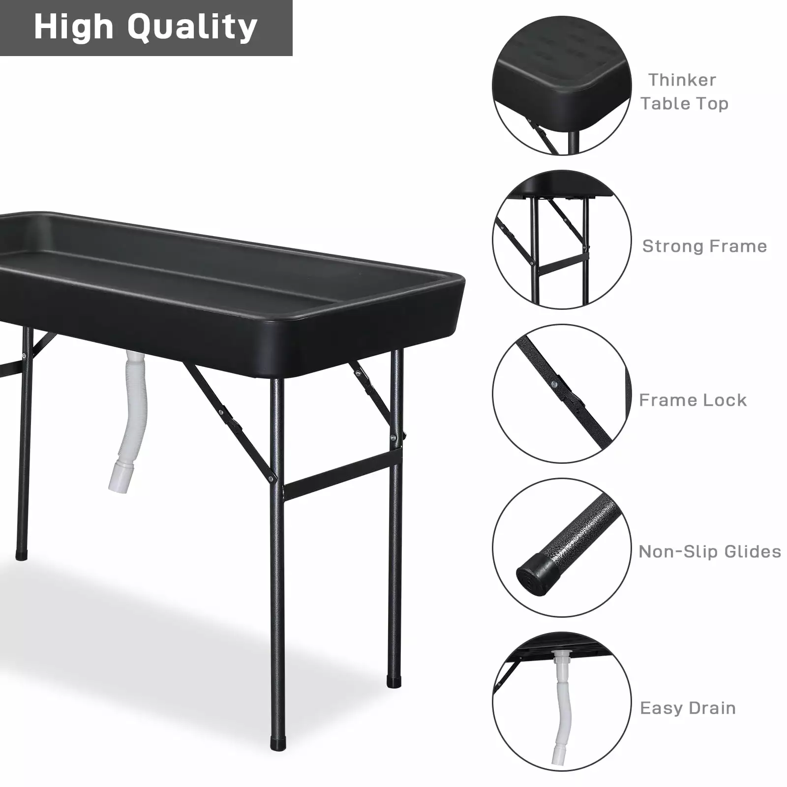 INDENTED STRUCTURE AND KEEP COOLER – deep 3.5 ice bin allows users to hold a large quantity of ice to keep their products cooled and fresh for longer periods of time.Lightweight and durable plastic tabletop with Collapsible Steel Legs maintain years of use