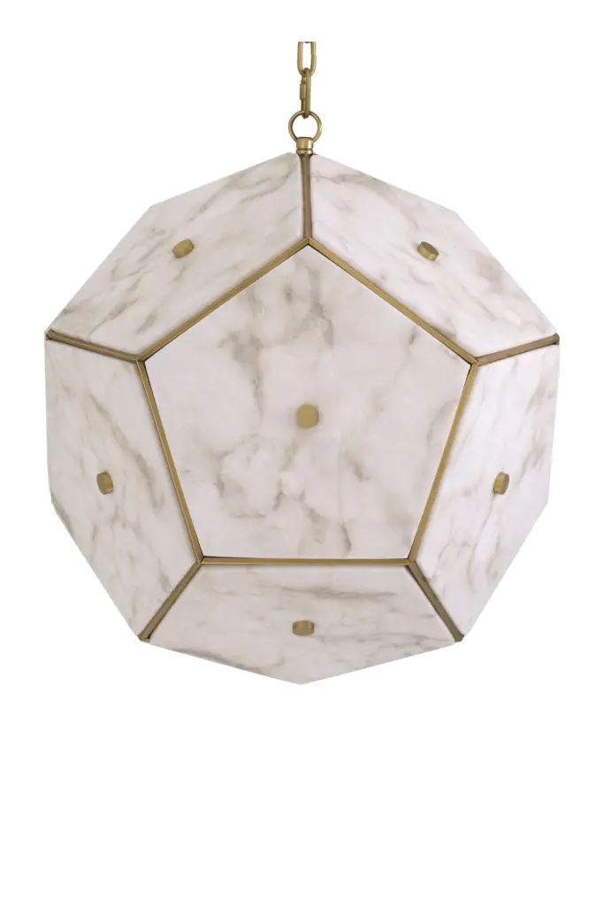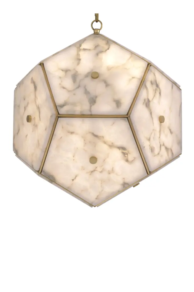 The rare beauty and translucency of alabaster inspired us to create Lantern Gallo. Exemplifying the rich vibrance of this beguiling mineral stone, the pentagonal facets of this gorgeous pendant lamp allow soft ambient light to pass through.