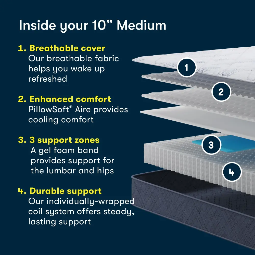The Serta® Perfect Day Mattress® 10” Medium supplies comfort and convenience. Our mattress in a box fully expands quickly so you can sleep on it right away. This quilted innerspring mattress features our Supportive coil system for durability and all-night support. Pillowsoft® Aire Foam offers airflow and boosted cushioning for exceptional comfort. Plus, Serta® Pillowsoft® Foam provides gentle contouring support. Looking for lower back care? A gel foam band provides our signature zoned comfort supporting for the lumbar and hips. Whether you’re looking for a guest room, a kid’s mattress, or for yourself, the Serta Perfect Day Mattress has what you need, all within your budget.
