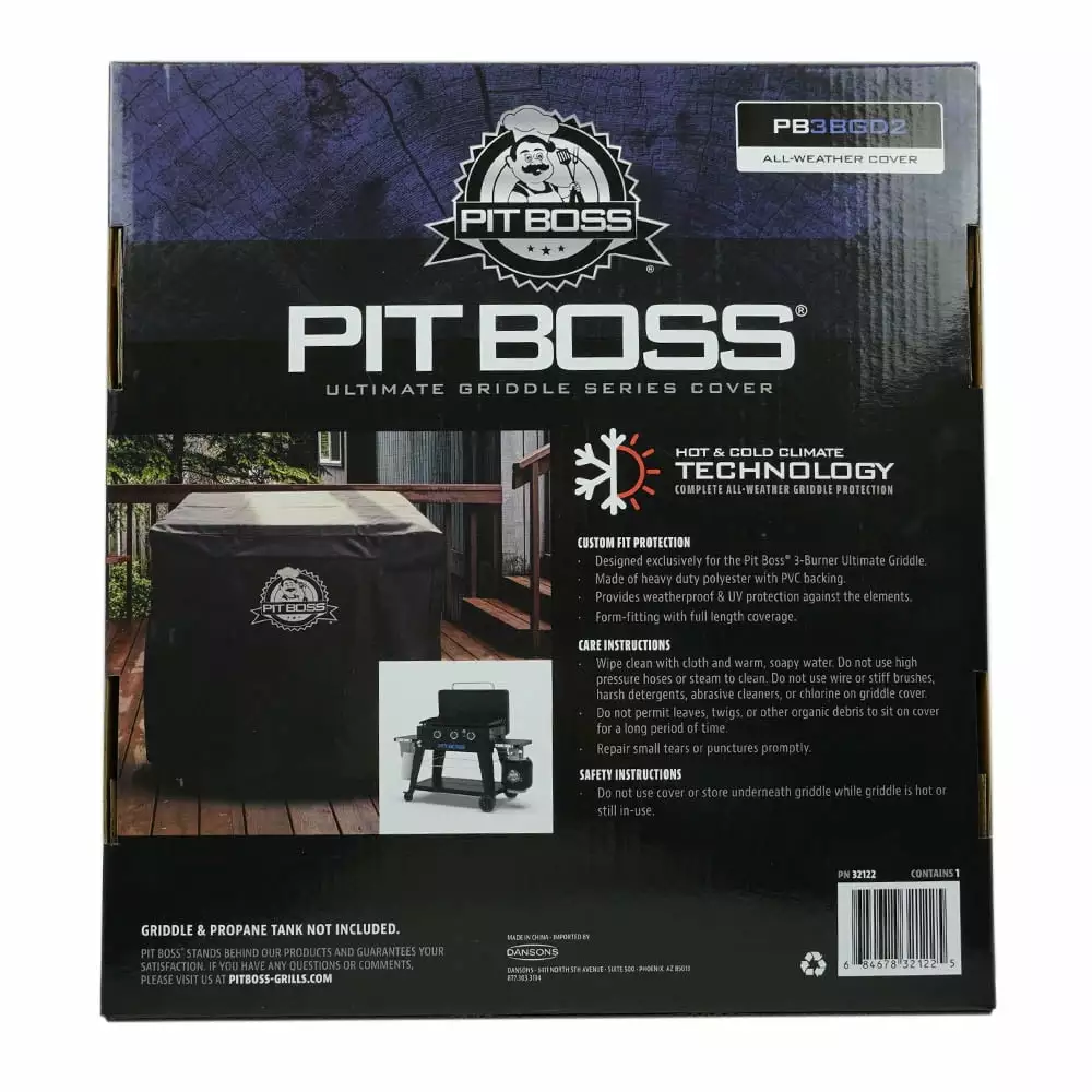 Protect your 3-Burner Ultimate Griddle with this custom fit cover. This griddle cover provides full-length coverage. it is 600D polyester with PVC reinforced lining. It is weather resistant featuring UV Protection. and a drawstring lock for quick tightening and secure coverage. *also fits Pit Boss 3-Burner Sierra Griddle