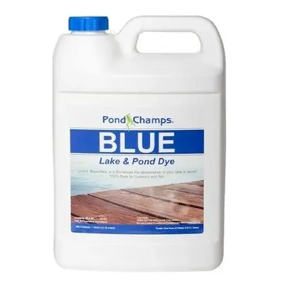Pond Champs pond dye is a true blue pond dye. It has no other color added except blue. If your pond is currently clear it will give the pond a deep blue appearance. If your pond is currently muddy, brown it can give your pond a very light blue tint until the muddiness clears. Royal blue is the most popular color pond dye used on the market. Blue pond dye out sells black and blue-green dye 3 to 1.