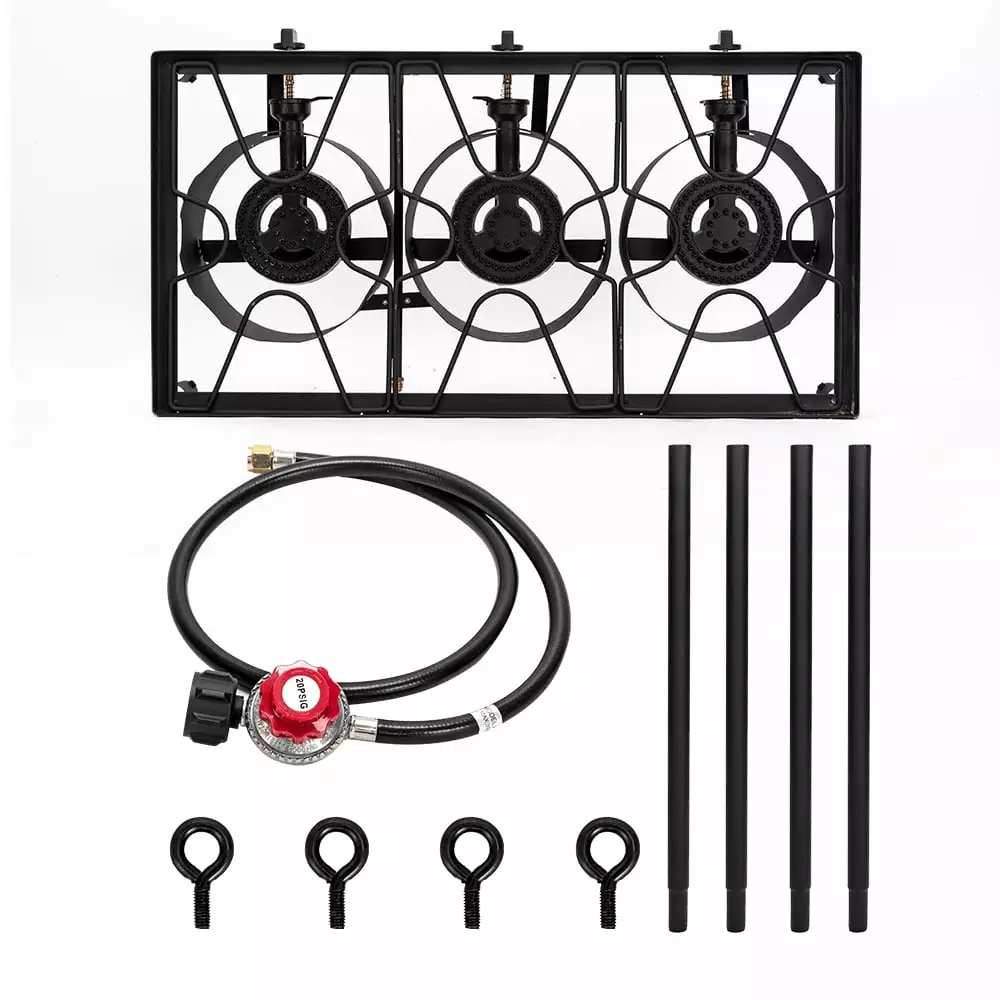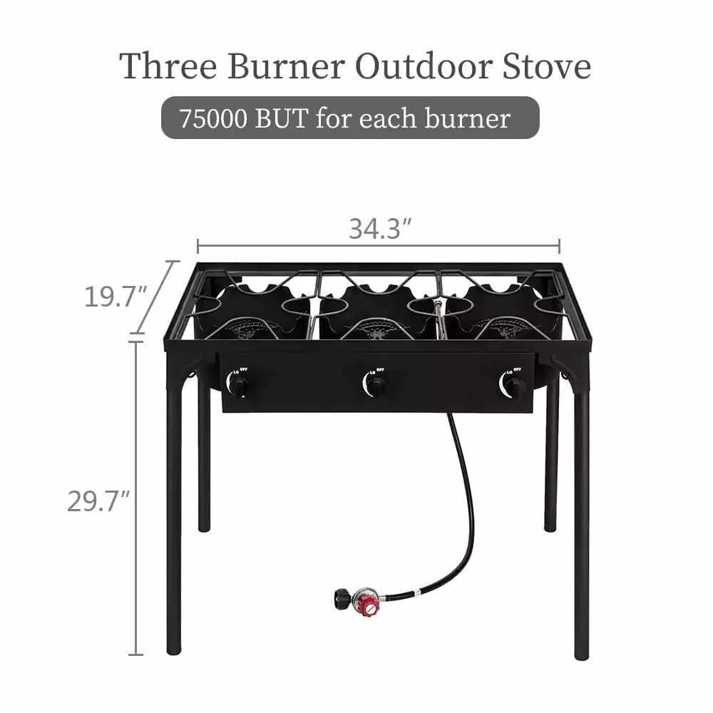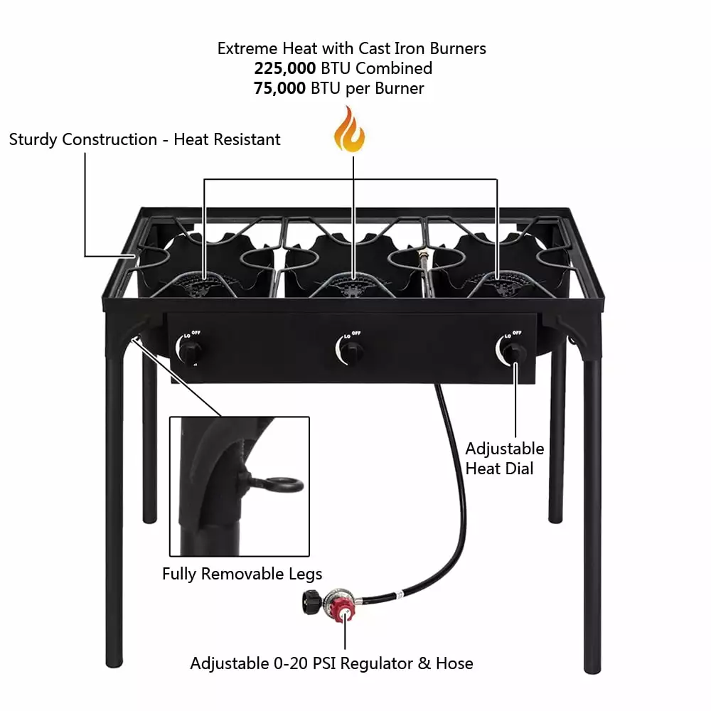This powerful three burner. equipped with a cast iron head. outputs a whopping BTU of 225000. And it can adjust the firepower to make your cook more delicious. It is suitable for various types of pot because of burner bracket. So you can enjoy cooking outdoor with your family to have a happy time. Do not hesitate. just buy it.