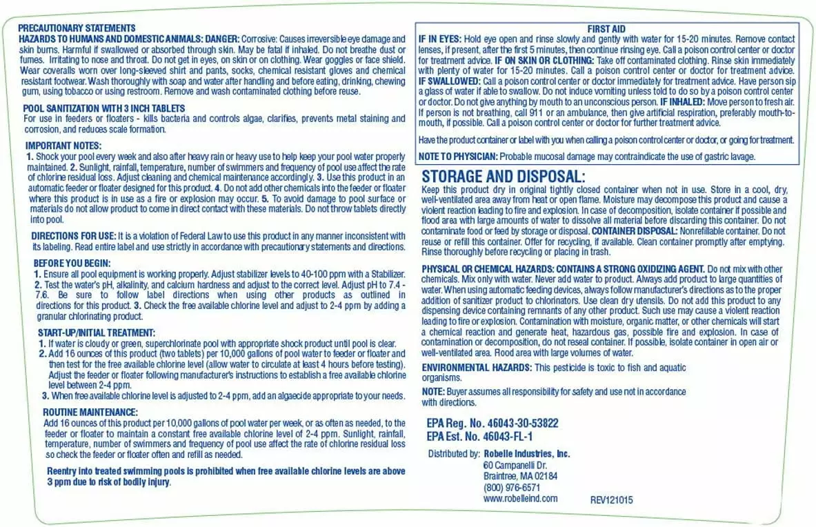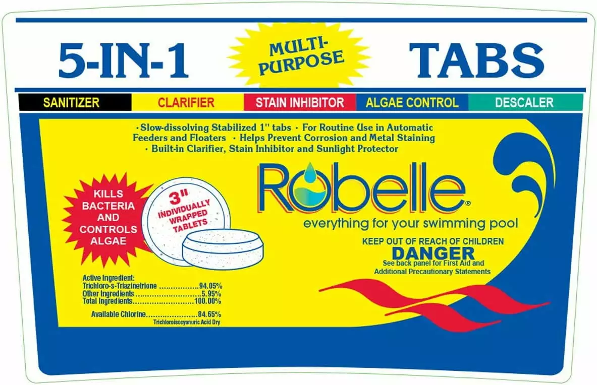 Robelle 5-In-1 Swimming Pool Multi-Purpose 3" Chlorinating Tabs contain a proprietary blend of ingredients that will reduce the amount of pool chemicals needed to keep your swimming pool clean. Each 3" 8 oz. tab is individually wrapped for easier and safer handling. stabilized to prevent burn-off. and are slow dissolving to maintain a proper free chlorine level. Built-in clarifier produces crystal-clear water. Stain-inhibitor prevents and removes stains caused by metals and minerals. Includes algae preventer that will leave a algaecide residual to help get rid of algae and prevent it from coming back. Built-in descaler will prevent the build up of scale which can cause corrosion. Because your sanitizer has these additional chemicals built in. you will spend less money on pool supplies. For use in feeders or floaters – kills bacteria and controls algae. clarifies. prevents metal staining and corrosion. and reduces scale formation. Important notes: Shock your pool every week and also after heavy rain or heavy use to help keep your pool water properly maintained. Sunlight. rainfall. temperature. number of swimmers and frequency of pool use affect the rate of chlorine residual loss. Adjust cleaning and chemical maintenance accordingly. Use this product in an automatic feeder or floater designed for this product. Do not add other chemicals into the feeder or floater where this product is in use as a fire or explosion may occur. To avoid damage to pool surface or materials do not allow product to come in direct contact with these materials. Do not throw tablets directly into pool. Before using this product ensure all pool equipment is working properly. Adjust stabilizer levels to 40-100 ppm with a Stabilizer. Test the waters pH. alkalinity. and calcium hardness and adjust to the correct level. Adjust pH to 7.4 – 7.6. Be sure to follow label directions when using other products as outlined in directions for this product. Check the free available chlorine level and adjust to 2-4 ppm by adding a granular chlorinating product. Start up and initial treatment directions: If water is cloudy or green. super-chlorinate pool with appropriate shock product until pool is clear. Add 16 ounces of this product (two tablets) per 10.000 gallons of pool water to feeder or floater and then test for the free available chlorine level (allow water to circulate at least 4 hours before testing). Adjust the feeder or floater following manufacturer s instructions to establish a free available chlorine level between 2-4 ppm. When free available chlorine level is adjusted to 2-4 ppm. add an algaecide appropriate to your needs. For routine maintenance: Add 16 ounces of this product per 10.000 gallons of pool water per week. or as often as needed. to the feeder or floater to maintain a constant free available chlorine level of 2-4 ppm. Sunlight. rainfall. temperature. number of swimmers and frequency of pool use affect the rate of chlorine residual loss so check the feeder or floater often and refill as needed. Robelle 5-In-1 Swimming Pool Multi-Purpose 3" Chlorinating Tabs will kill bacteria. control algae. clarify water. prevent metal staining and corrosion. and reduce scale formation.