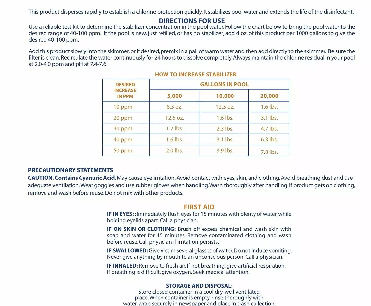 Robelle Chlorine Stabilizer and Conditioner will cut chlorine loss caused by sunlight. Customers save money when they use Robelle Chlorine Stabilizer and Conditioner. If you use Robelle Chlorine Stabilizer and Conditioner you can cut chlorine consumption by up to 25%. Robelle Chlorine Stabilizer and Conditioner will help sustain ongoing chlorine residual. Add this product to your pool in the spring and you will improve chlorine effectiveness all season long. This product disperses rapidly to establish a chlorine protection quickly. It stabilizes pool water and extends the life of the disinfectant. Use a reliable test kit to determine the stabilizer concentration in the pool water. Follow the guide below to bring the pool water to the desired range of 40-100 ppm. If the pool is new. just refilled. or has no stabilizer; add 4 oz. of this product per 1000 gallons to give the desired 40-100 ppm. Add this product slowly into the skimmer. or if desired. premix in a pail of warm water and then add directly to the skimmer. Be sure the filter is clean. Recirculate the water continuously for 24 hours to dissolve completely. Always maintain the chlorine residual in your pool at 2.0-4.0 ppm and pH at 7.4-7.6. For 5.000 gallon pools. to increase 10ppm add 6.3 oz.. to increase 20 ppm add 12.5 oz.. to increase 30 ppm add 1.2 lbs.. to increase 40ppm add 1.6 lbs.. to increase 50ppm add 2.0 lbs. For 10.000 gallon pools. to increase 10ppm add 12.5 oz.. to increase 20 ppm add 1.6 lbs.. to increase 30 ppm add 2.3 lbs.. to increase 40ppm add 3.1 lbs.. to increase 50ppm add 3.9 lbs.. For 20.000 gallon pools. to increase 10ppm add 1.6 lbs.. to increase 20 ppm add 3.1 lbs.. to increase 30 ppm add 4.7 lbs.. to increase 40ppm add 6.3 lbs.. to increase 50ppm add 7.8 lbs.. Contains 100% Cyanuric Acid.Increases Cyanuric Acid Level.Decreases Chlorine Loss due to Sunlight.Reduce Chlorine Consumption up to 25%.Contains 100% Cyanuric Acid.Improves the effectiveness of chlorine