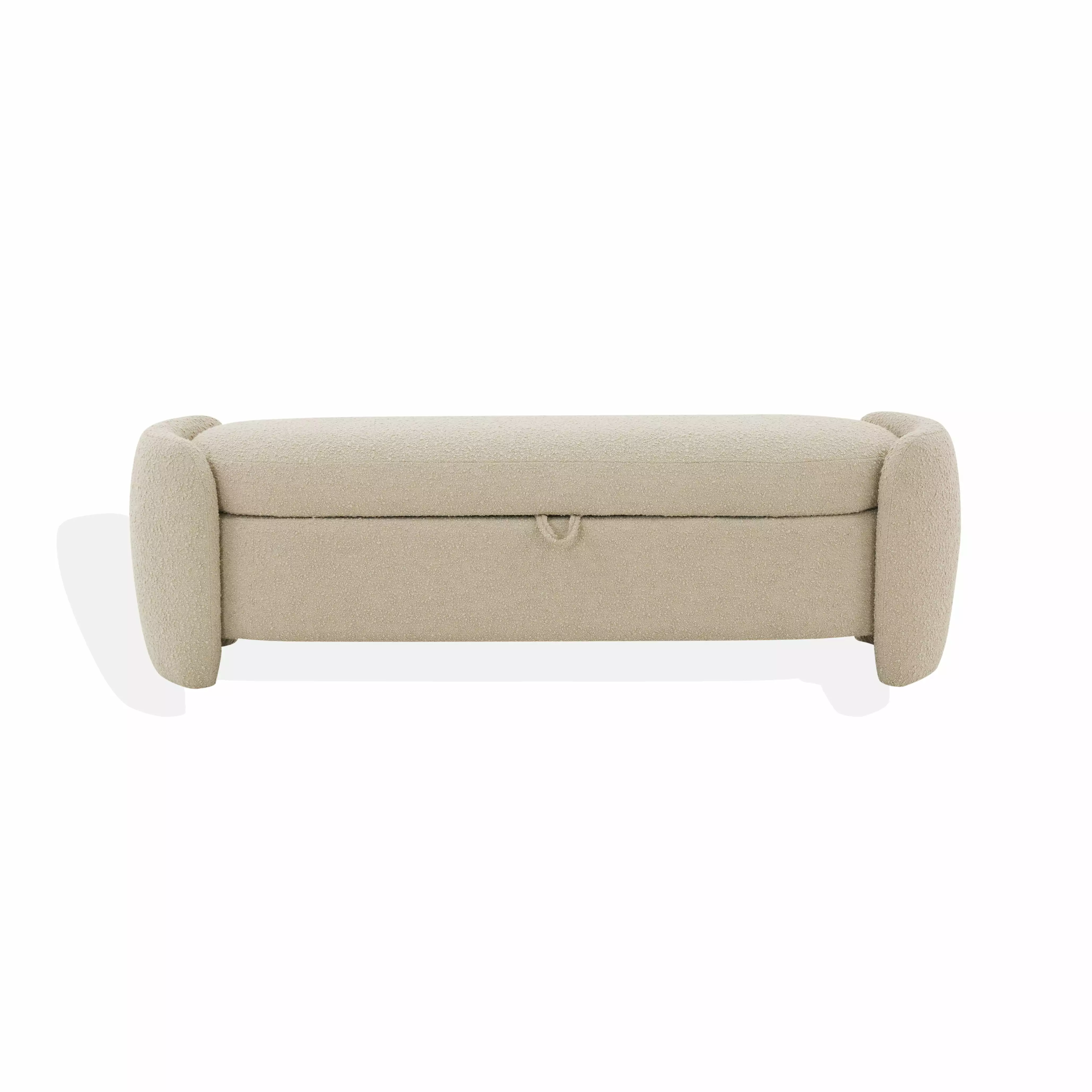 Give a contemporary update to your home with the sculptural beauty of our Danianna bench. It stands out with its curved. sculptural legs that beautifully cuddle a generously padded seat. The cozy and plush silhouette of our ottoman is accentuated with rich textures of boucle. Adorned in a graceful oatmeal shade. our bench serves as a welcoming addition to your entryway. bedroom. or living area. Both stylish and handy. the bench reveals storage underneath to become a convenient spot to store your pillows. throws. and magazines.