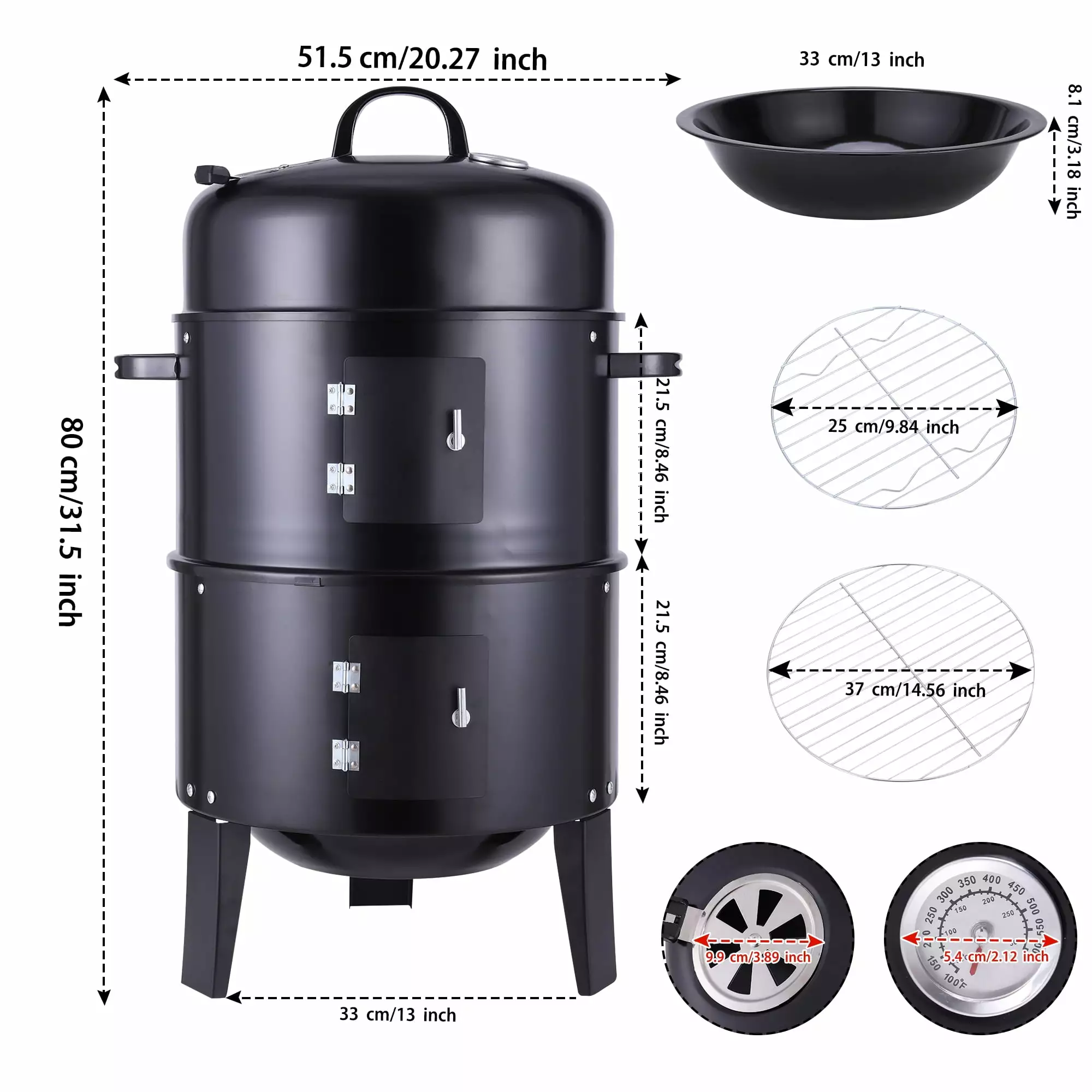 3 in 1 Design: This charcoal BBQ smoker could be divided into three layers. It also includes BBQ nets. water pan and charcoal pan which provides multiple uses. The bottom can be used as a fire pit and the adjustable barrel grill is ideal for steaming. grilling. baking or roasting. With two different heights. it can be a BBQ roaster or a smoker according to your needs. You could use it for outdoor cooking. smoking. steaming. baking. braising. roasting. searing