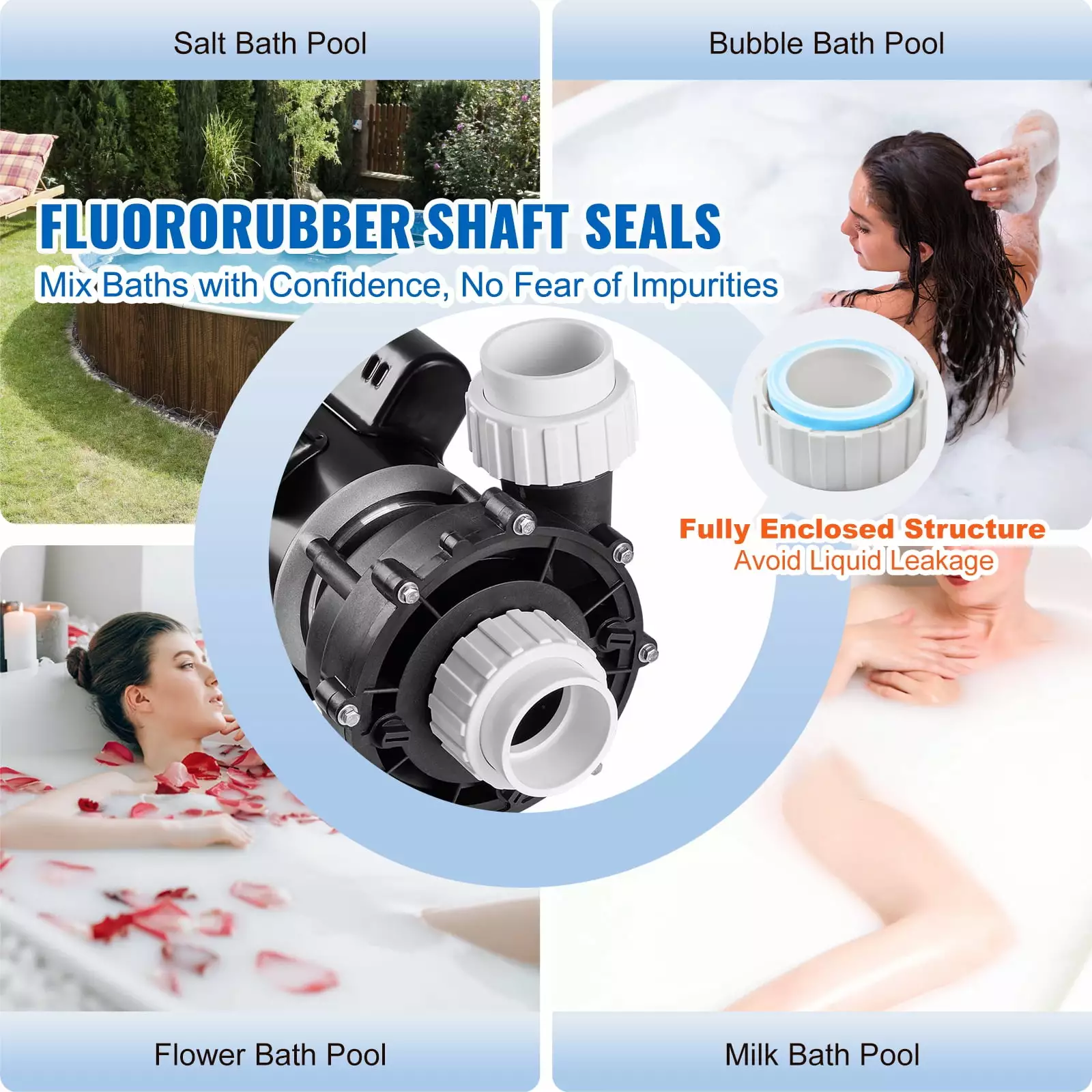- Seal Against Leakage: Anti-leakage is the key to the SPA pump for hot tubs. so we only use Fluororubber shaft seals. which have good resistance to high temperature. corrosion. oil. and aging and are able to maintain stable sealing performance in harsh working environments. It effectively avoids the leakage of fluids and particles. You can enjoy different types of soaking massages without worrying about infiltration problems.