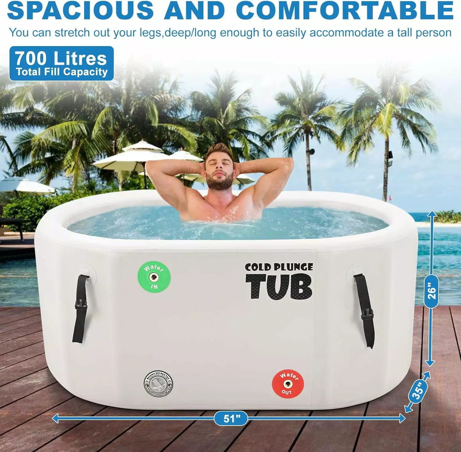 Large And Robust: Measuring at 51.2in*34.6in*25.6in. 185 gallons. the cold tub is designed to provide a fully immersive experience. With a large capacity. our cold plunge ice bath for athletes ensures that you can fully submerge yourself in cold water and receive all the benefits of ice bath. The perfect 5 cm thick FIBERGLASS MATERIAL bath tub is STRONGER and more DURABLE than an ordinary bath tub. NO leak and prevent falls.