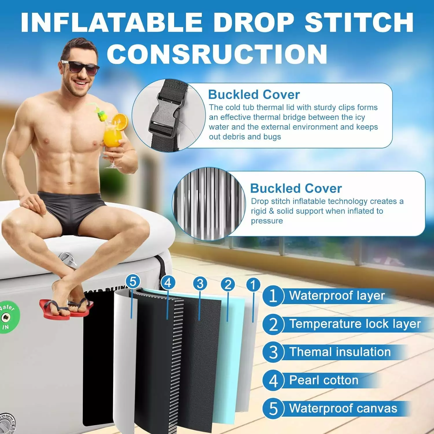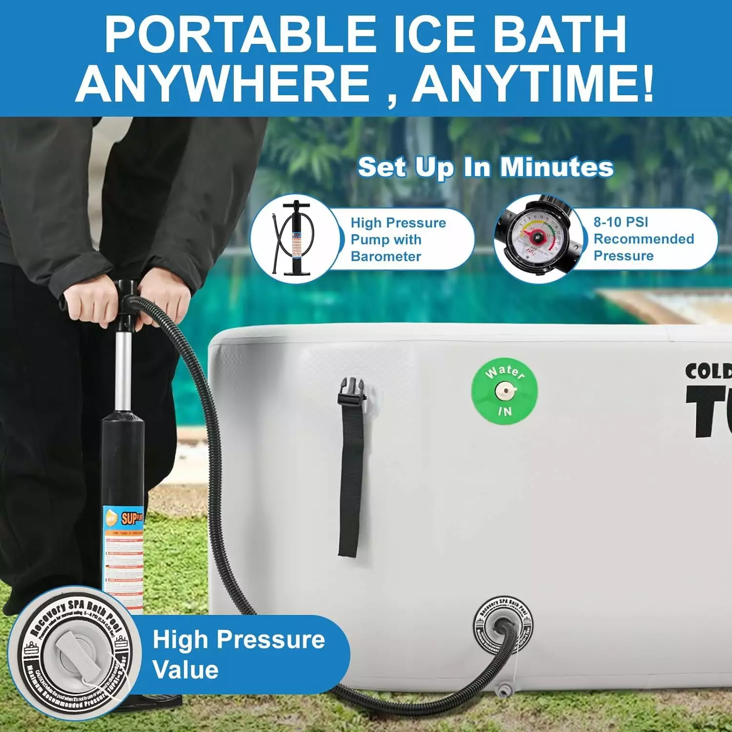 Slsy Inflatable Ice Bath Tub measuring at 51.2in*34.6in*25.6in. 185 Gallons. the cold tub is designed to provide a fully immersive experience. Our ice bath tub are quick and easy to assemble. taking less than 5 minutes to set up. The included drain plug allows for easy drainage and cleaning. making maintenance a breeze. Simply rinse the tub out and refill with cold water and ice as desired. Slsy cold plunge tub promotes speedy muscle recovery. enhances circulation. strengthens the immune system. and fosters overall wellness. making it an invaluable tool for athletes and wellness enthusiasts alike.