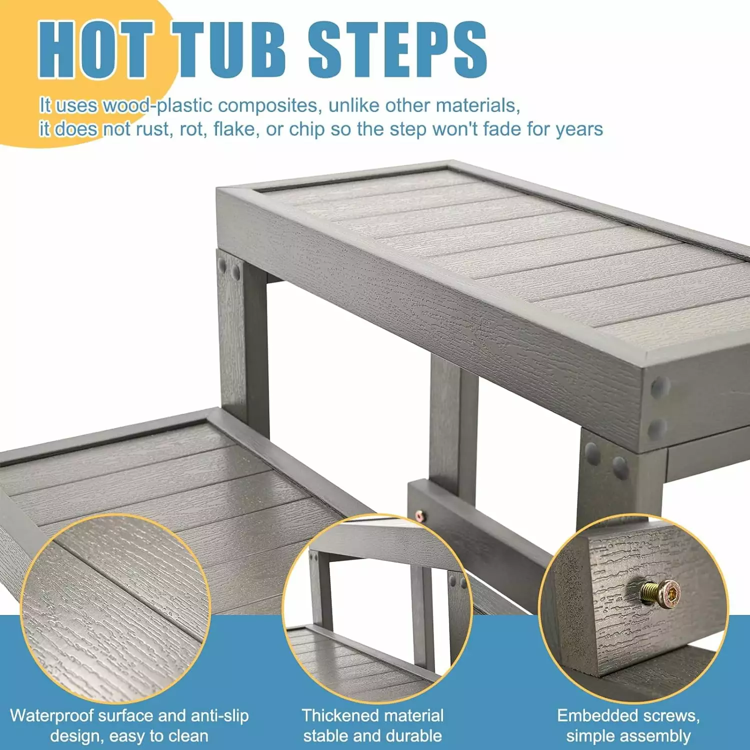 High-quality Spa Steps: It uses wood-plastic composites. unlike other materials. it does not rust. rot. flake. or chip so the step won’t fade for years.