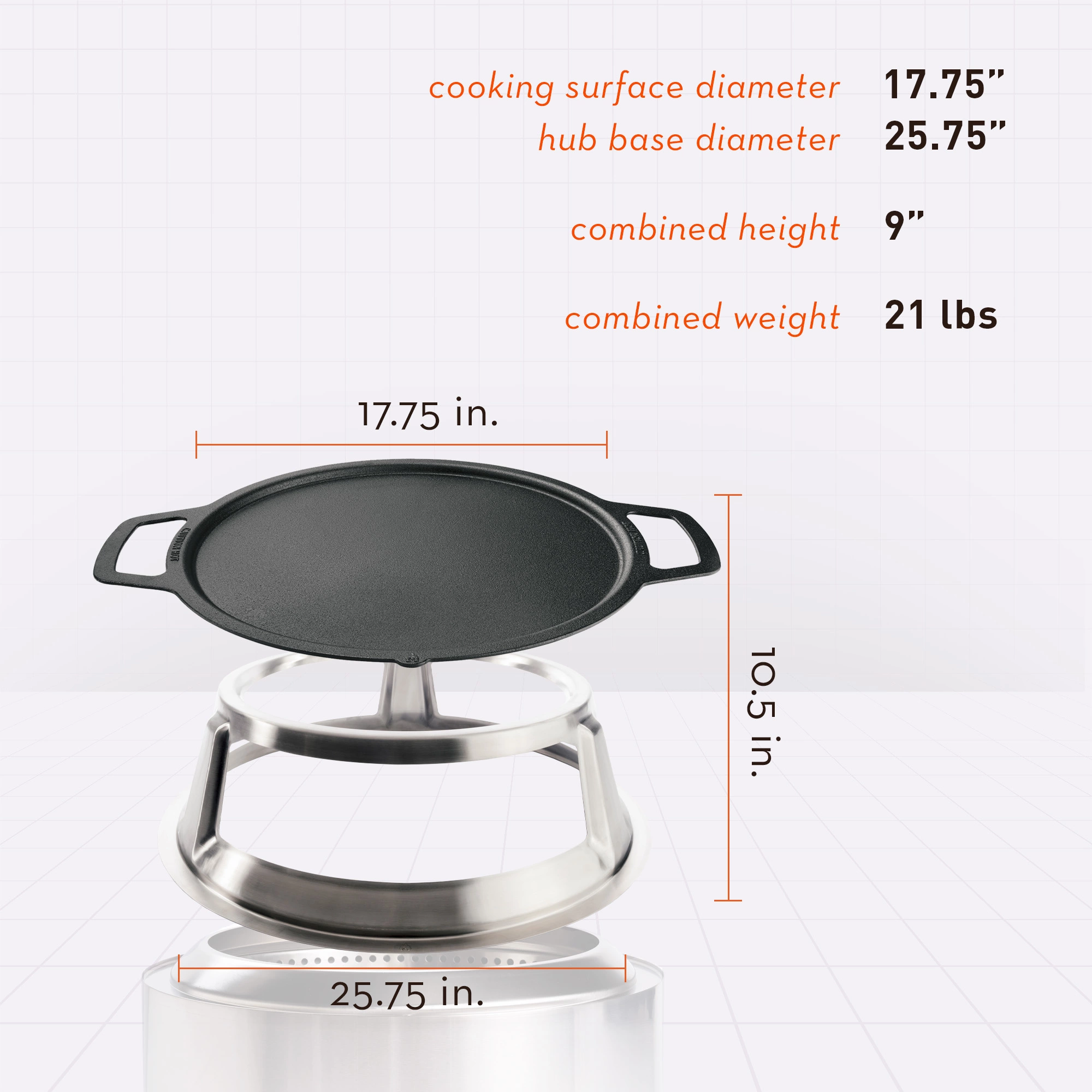 - PRODUCT SPECS: Griddle made from Cast Iron and Stainless Steel Hub. Weight: 21 lbs. Size: Cooking surface diameter 17.75. Hub Base diameter: 25.75. Combined height: 9. Hub offers Cast Iron Griddle a precise 8 lift for the above the super-hot cooking coals. Fuel: Use Lump kiln-dried chunk wood to light up your fire pit.