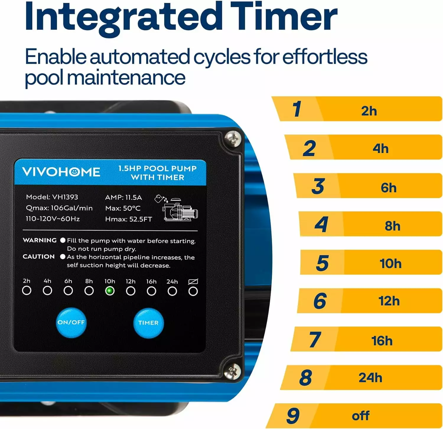 - INTEGRATED TIMER – Equipped with a built-in programmable dual-mode timer. our self-priming pump offers convenience by automating pump operation based on your preference; With 9 options ranging from 2 to 24 hours. the timer repeats the cycle daily or only runs for one single cycle until the next set; The timer allows you to schedule operation during off-peak hours. saving energy consumption and utility costs and freeing up time for other activities