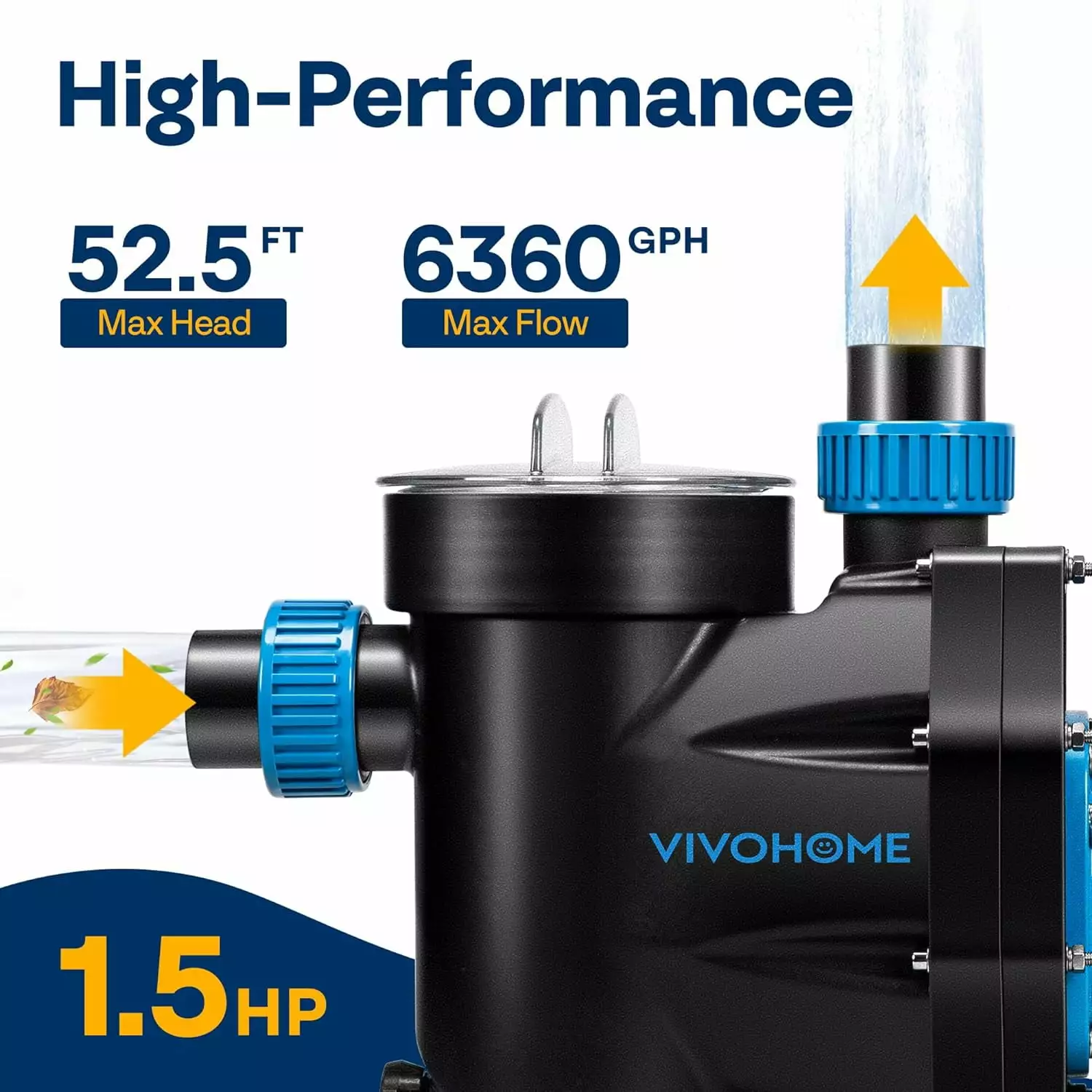 - HIGH-PERFORMANCE PUMP – The 1.5 HP DOE-certified motor is equipped with copper wire that can keep the pump efficient. stable. and safe; The max flow can reach 6360 GPH. while the max head is 52.5 ft; It also provides thermal protection. which allows for a longer service life compared to an ordinary motor; The impeller can and ensure efficient water circulation