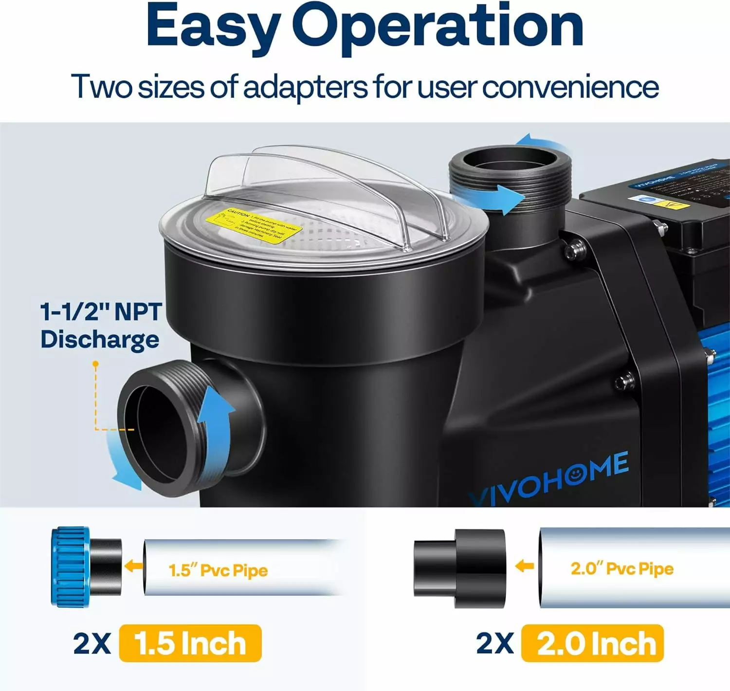 - EASY OPERATION – The pool pump is equipped with adapters compatible with both 1.5-inch and 2-inch PVC pipe sizes. like V40 and N50. in compliance with US standards (fits 2.0-inch and 2.5-inch PVC Hose); Teflon tape needs to be wrapped between the female and slip unions to seal and prevent leaks