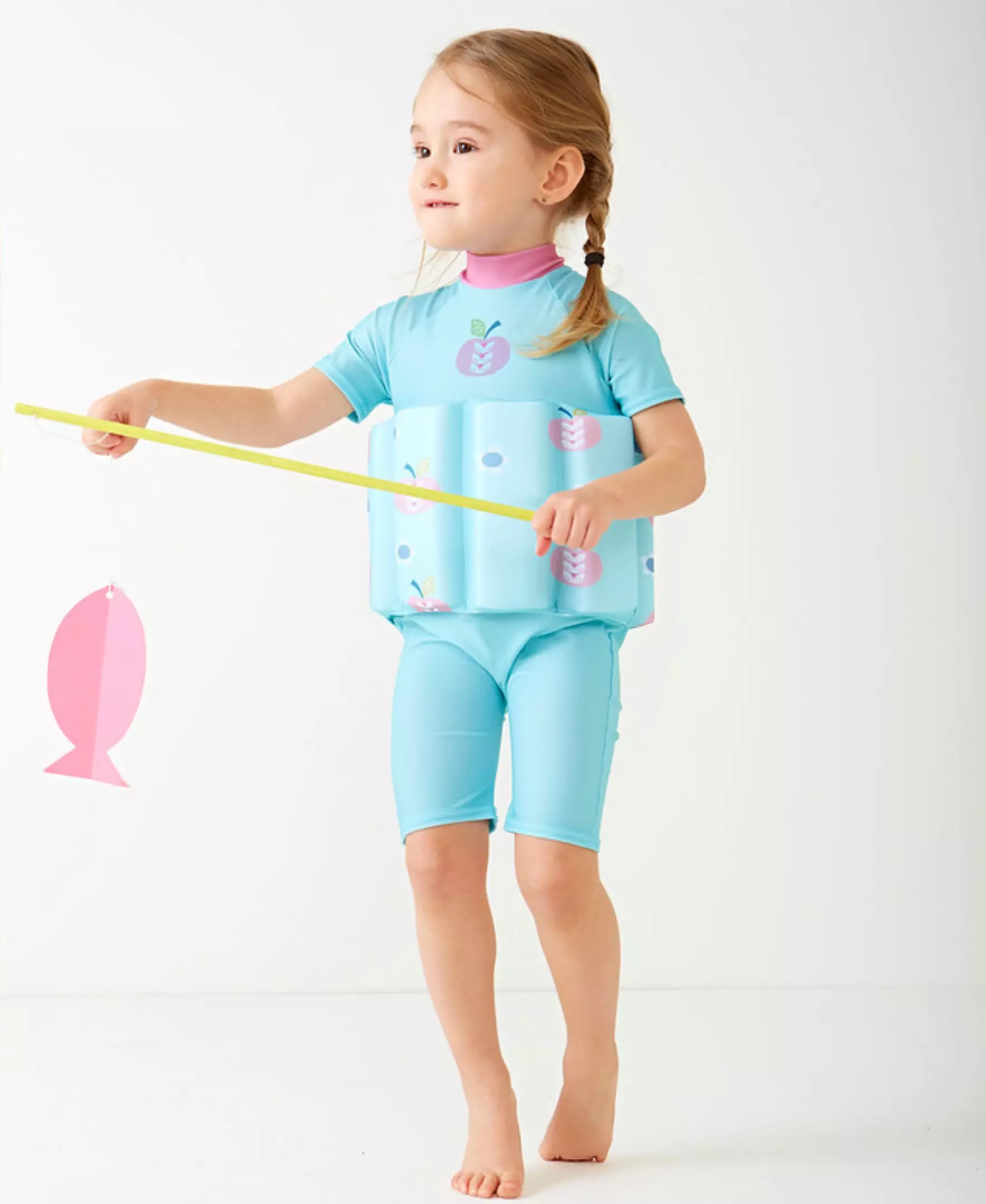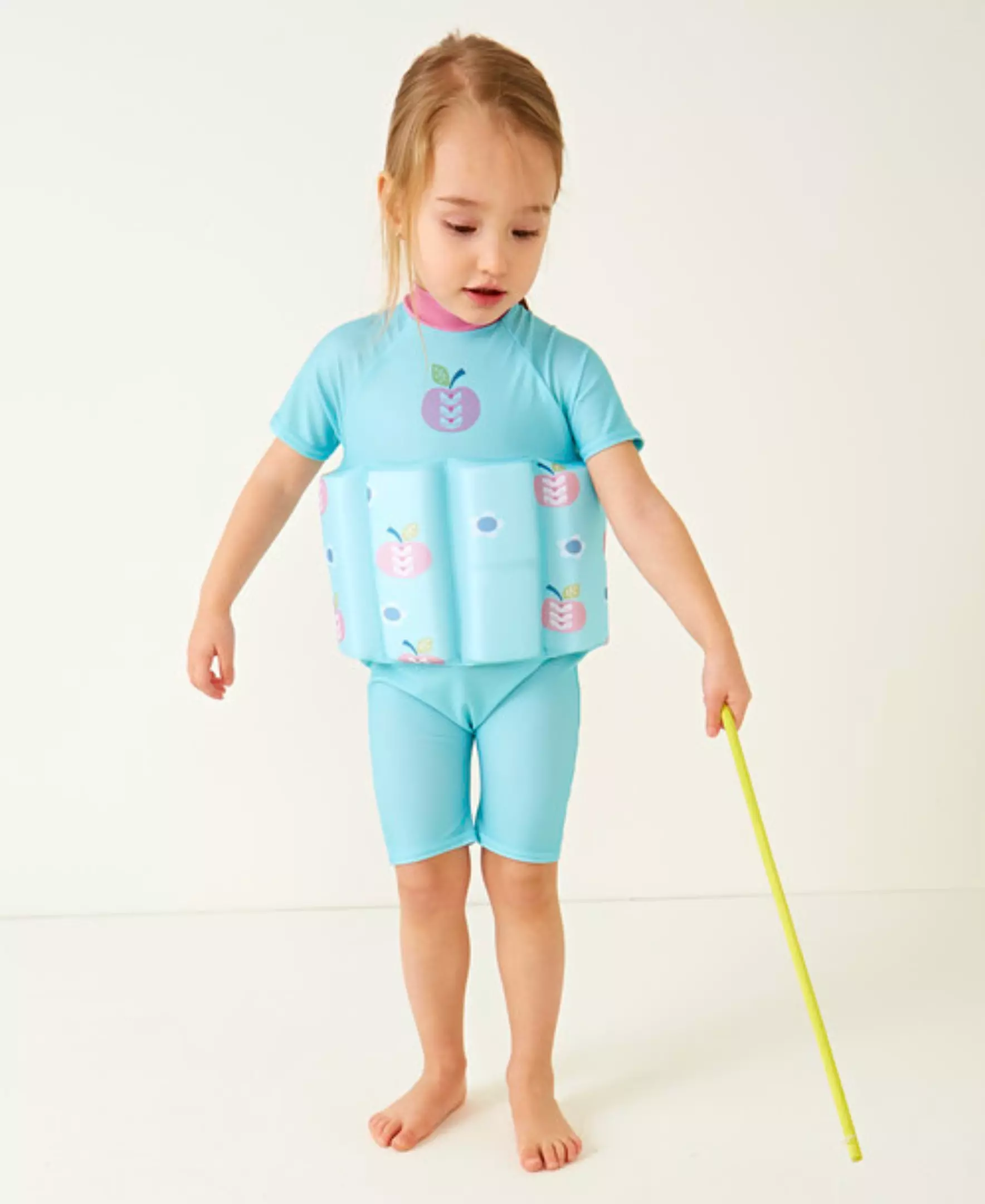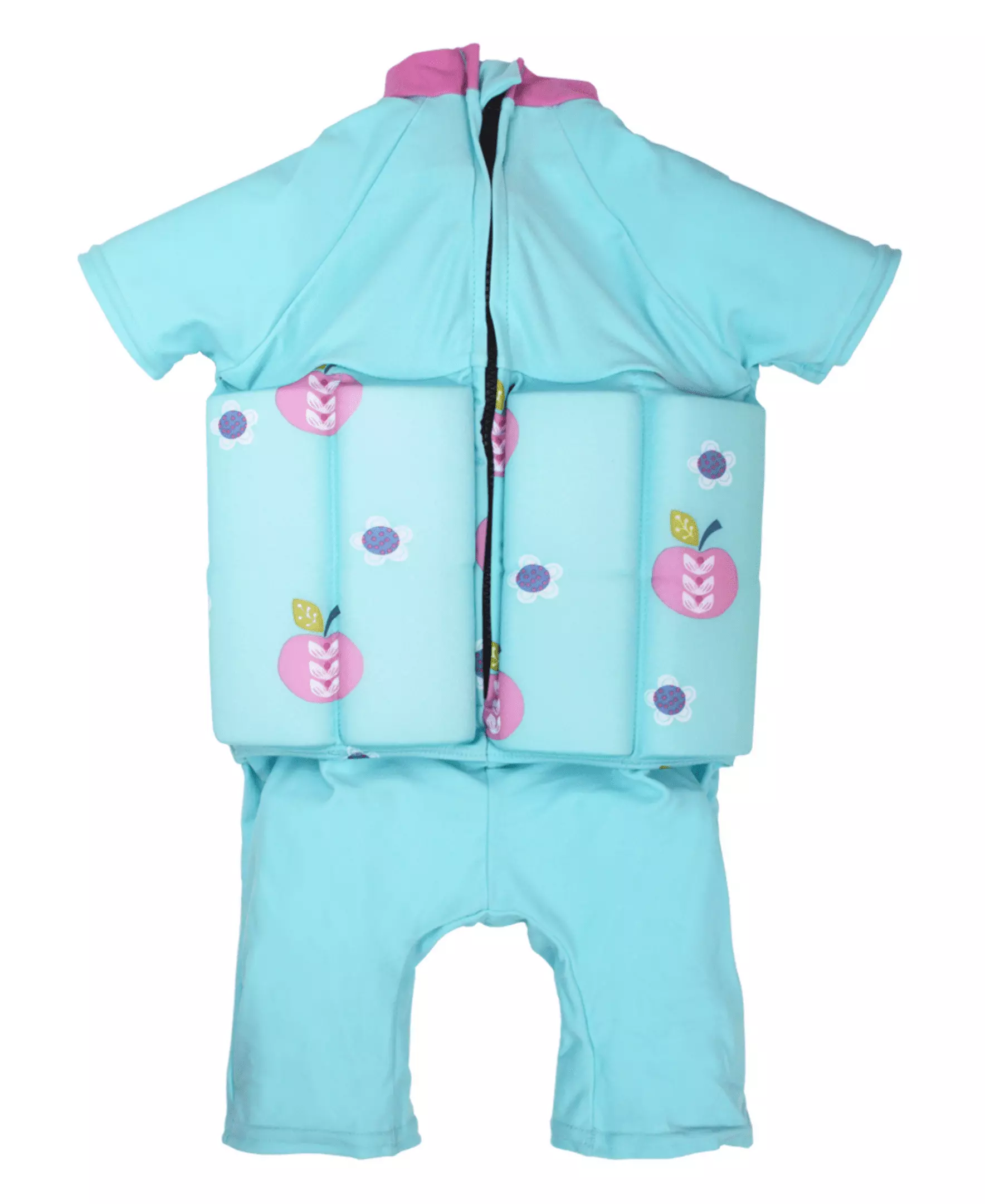 The Splash About Kids UV Floatsuit is designed to help children learn to swim. whilst protecting them from the sun’s harmful rays. Each UV Floatsuit comes with 16 removable float bars. that can be gradually taken out as the child finds their natural water balance and grows in confidence in the water. The UV Floatsuit holds children in the correct learn to swim position. and leaves their arms unrestricted. to enable them to practice their strokes without any bulky armbands getting in their way. This adjustable buoyancy system is explained in detailed instructions that come with the UV Floatsuit. to ensure a safe and fun swimming experience for you and your child. Please note. the UV Floatsuit is not a life- saving device and must be used under the constant supervision of an adult. It is normal for a child to lean forward towards to water when first wearing the UV Floatsuit. Hold their hands until they find their balance in the suit. The child is in the correct position when their shoulders are level with the water and their body tilted forward slightly. Holds children in the correct position for learning to swim UV Protection across the shoulders. back and neck Removable Float bars to adjust buoyancy Easy change zip at the back of the floatsuit Full Instructions included No need for Bulky Armbands.