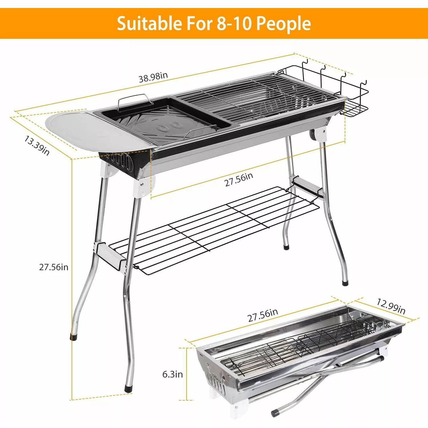 - [Upgraded Large Capacity]The folding campfire grill assembled size of 38.98×13.39×27.56in(99x34x70cm). Barbeque area size up to 25.79x 11.61in(65.5×29.5cm).the size is enough large space for a family gathering at the park. or party with friends at patio.It is suitable for about 8-10 people.