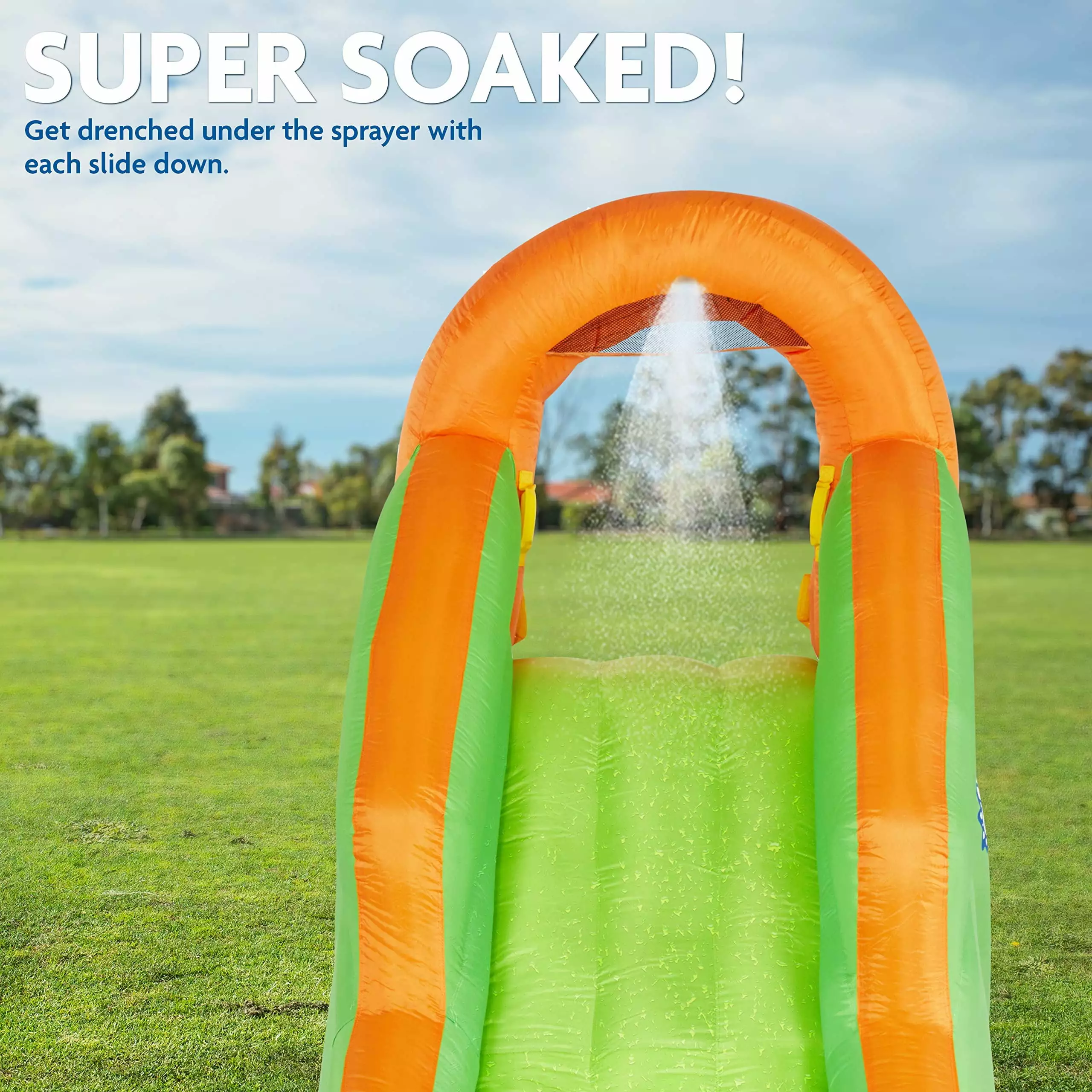 This inflatable pool has a soft bounce water slide. pool area & pool slide. Kids will have loads of space to play on this blow up water slide. The climbing wall goes to the top of the inflatable pool slide so they can zoom down the waterslide. Made with nylon. the kids water slide surfaces are built to last. Kids will be able to play and splash to their heart’s delight in this inflatable pool with slide. Better than other blow up water slides for backyard.