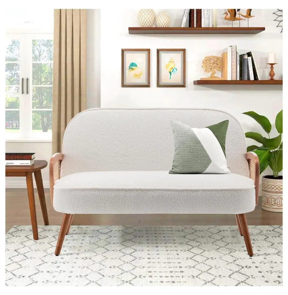 - ??**???????? ???? ??????????**This mini sofa has padded back which will give you enough flexibility when you lean on it.The small white loveseat is made of teddy fabric material with a solidwood frame as the basic structure.The teddy fabric material is comfortable and not easy to pilling. fading.Easy to clean the hair on the seat.