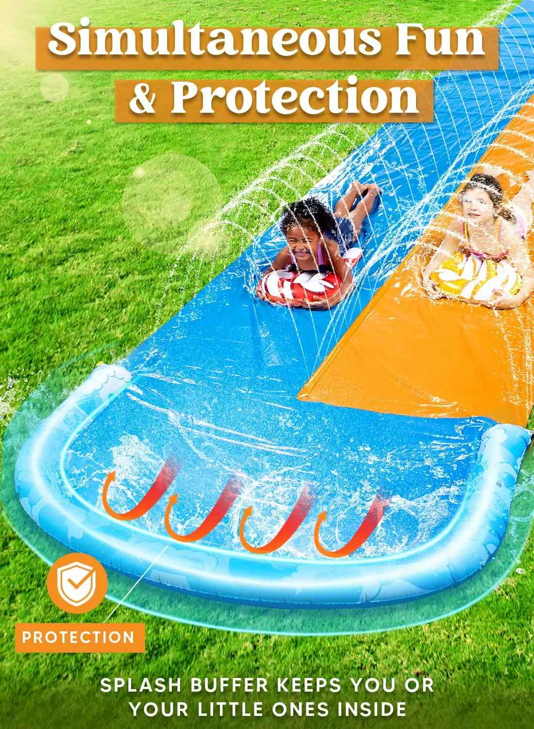 Syncfun new children’s water slide summer play toys outdoor grass water spray double surfboard garden toys. There are sprinkler holes all around both sides of the slide that are specially designed to give maximum wetness. for maximum wheee! This amazing backyard toy has great water coverage over the whole slide. which will keep kids sliding fast. and eager to soak up the water fun!