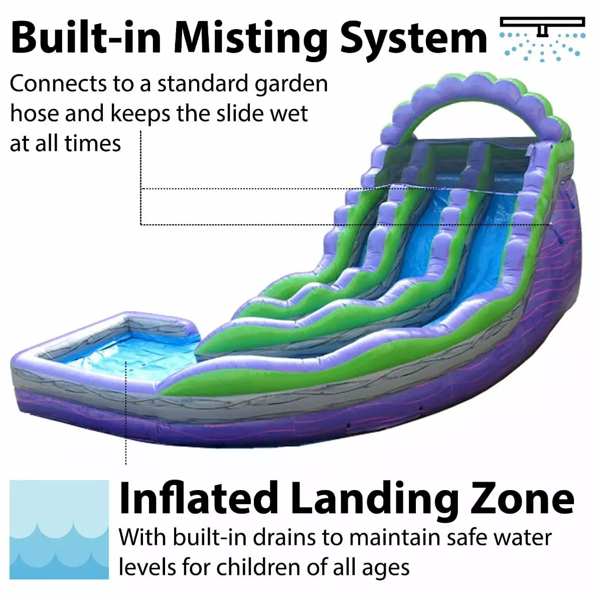 The 19′ Curved Purple Marble Commercial Inflatable Water Slide is like a traditional inflatable water slide. but with a twist… or should we say a curve This big water slide offers TWO sliding lanes that curve for an extra thrill. The built-in Misting System connects to a standard garden hose for use on a hot day or turn off the water and use it as a dry slide on a cool day. This inflatable water slide provides fun and excitement to kids of all ages and with its gender-neutral colors. it can be utilized for both boys and girls events. allowing it the potential to be one of the most popular units of your bounce house rental business.