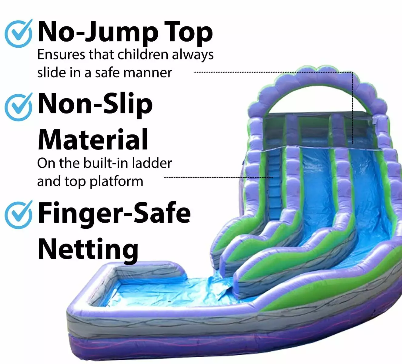 Our commercial-grade inflatables are constructed from 15 oz PVC Vinyl with additional vinyl patches sewn in at all stress points to allow for maximum strength. durability and most importantly. safety. The built-in ladder to the top platform utilizes a non-slip material and the slide itself is equipped with finger-safe netting as part of our No Jump Top. that ensures that children will always use the water slide in a safe manner. The pool at the base of the water slide has a built-in drain to ensure safe water levels for children of all ages.