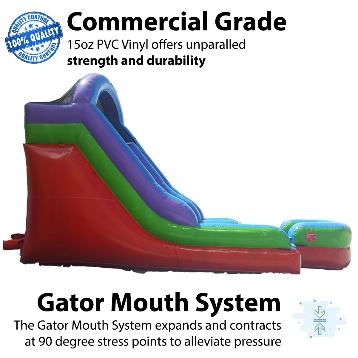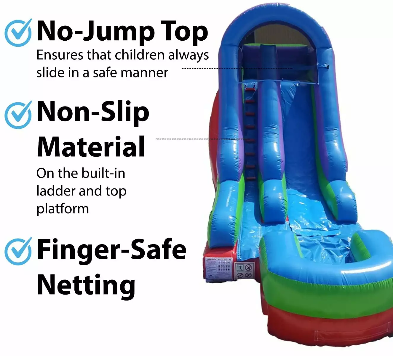 Our commercial-grade inflatables are constructed from 15 oz PVC Vinyl with additional vinyl patches sewn in at all stress points to allow for maximum strength. durability and most importantly. safety. The built-in ladder to the top platform utilizes a non-slip material and the slide itself is equipped with finger-safe netting as part of our No Jump Top. which ensures that children will always use the water slide in a safe manner. The pool at the base of the water slide has a built-in drain to ensure safe water levels for children of all ages.
