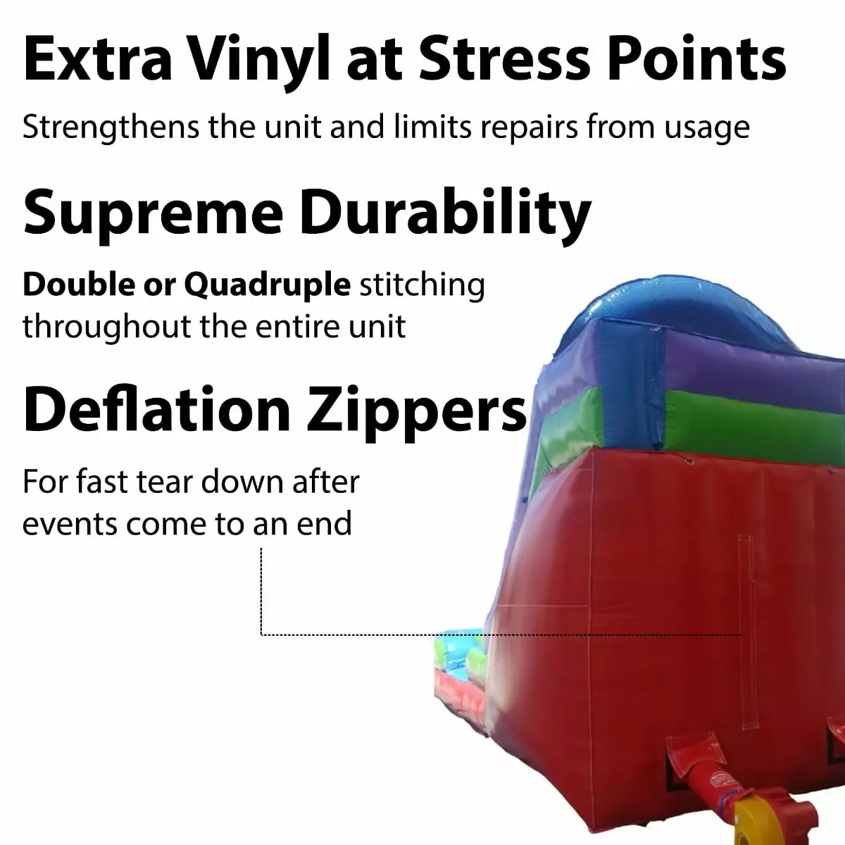 The featured Gator Mouth system alleviates pressure at 90-degree stress points. adding just another layer of durability to your unit and extending its longevity through the wear and tear of a busy rental season. All seams have been triple-threaded and heat-welded for a superior seal that eliminates the chances of water seeping inside of the unit. as well as preventing dirt and sand from damaging the seams. thus prolonging the life of your inflatable and minimizing repairs. The unit has commercial-grade webbing. hook and loop fasteners throughout. and zippers for easy deflation when it’s time to pack up at the end of the day.