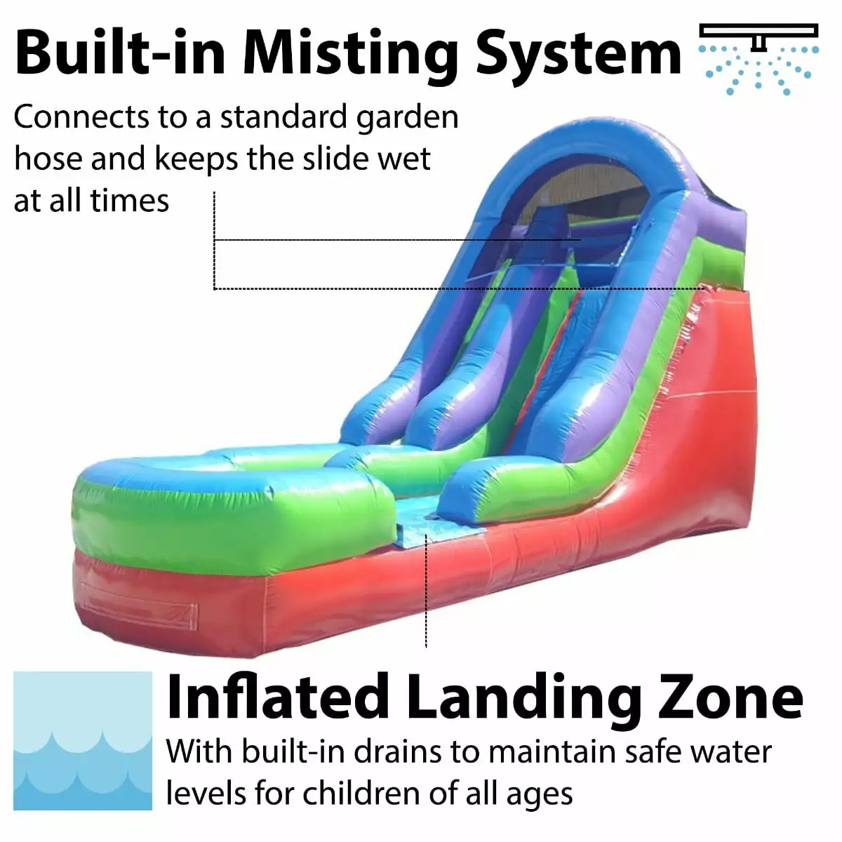 Kids of all ages simply adore cooling off on a hot summer’s day with a big water slide like the 15′ Retro Commercial Inflatable Water Slide. Simply connect the built-in Misting System to a standard garden hose on a hot day or turn off the water and use it as a dry slide on a cool day. This inflatable water slide provides fun and excitement to kids of all ages and with its gender-neutral colors. it can be utilized for both boys and girls events. allowing it the potential to be one of the most popular units of your bounce house rental business.