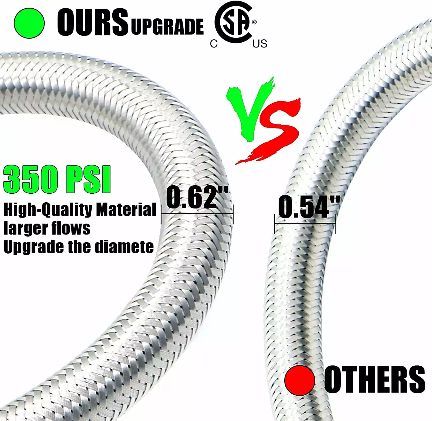- [Premium Material]3/8 female flare fittings on both ends and 5 different types of adapters fittings kit of this 3/8 propane hose are made of 100% Solid Brass to ensure secure and durable for long-lasting to use. The 3/8 Female Flare propane hose is made of durable stainless steel braided with anti corrosion. anti-aging. air tightness. heat-resistance. flexibility features. This propane extension hose with CSA Certification. ensures air tightness and stability. High Pressure: 350 PSI.