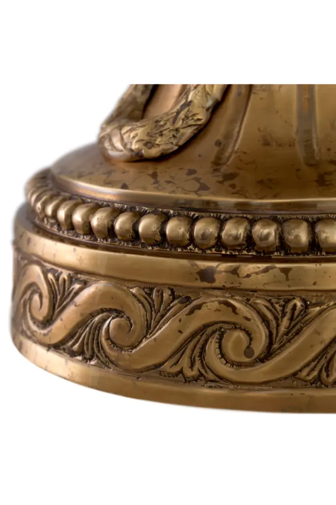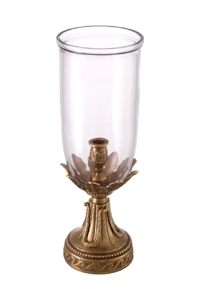 The “Hurricane Vitruvian” brilliantly blends form and function in vintage brass finish with clear glass. At 18 inches tall and Dia6 inches, this piece finds inspiration in Neoclassical aesthetics, sporting Vitruvian scrolls and laurel leaf swags reminiscent of the Louis XVI era. Beyond its decorative allure, the glass shade serves a practical purpose, guarding the candle’s flame from unruly drafts. This hurricane lamp beautifully marries historical elegance with functional design, offering both style and utility to your space.
