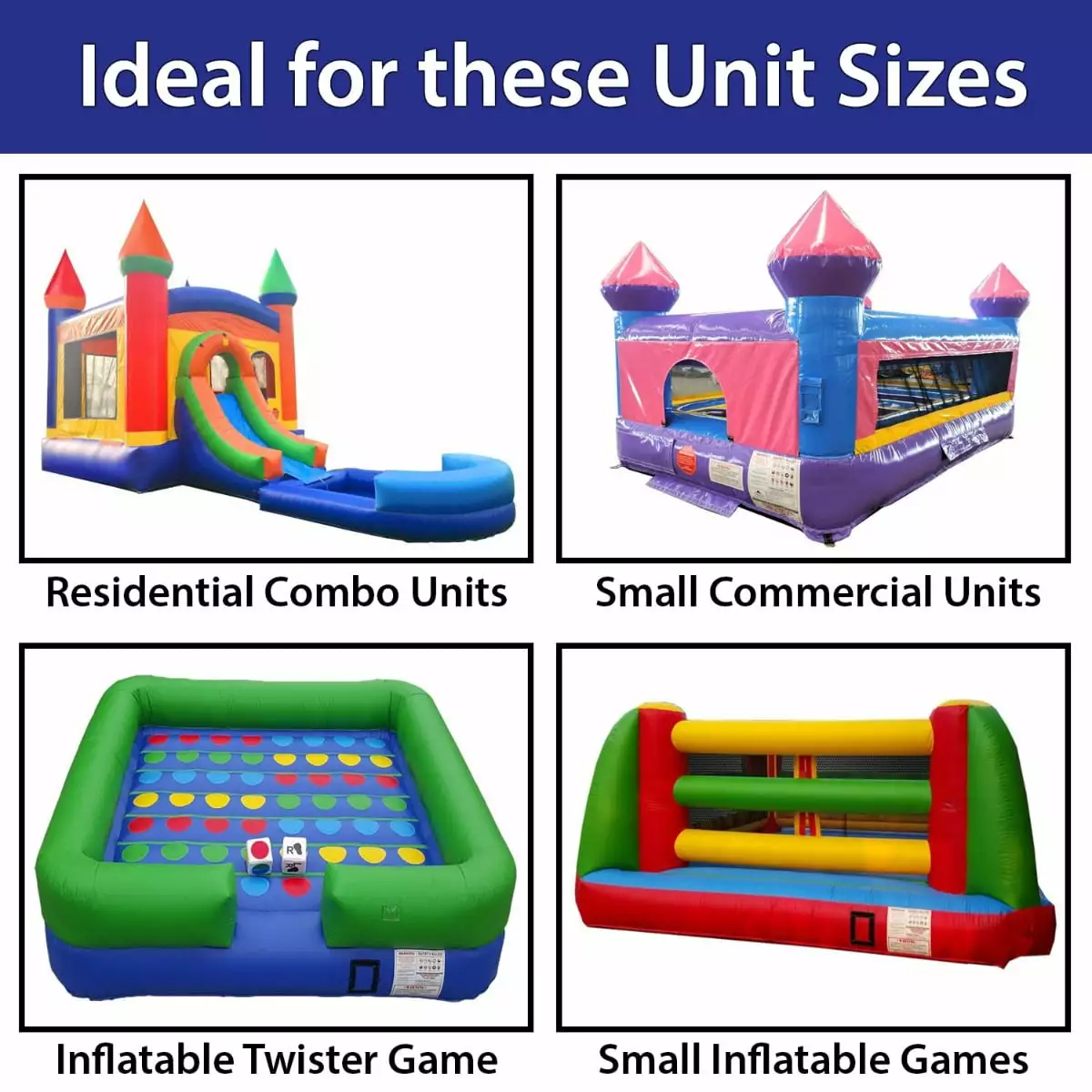 - Large – Dimensions: 54 x 60- Ideal for Large Inflatable Combos. Large Obstacle Courses. Medium to Large Slides and all Large Inflatable units