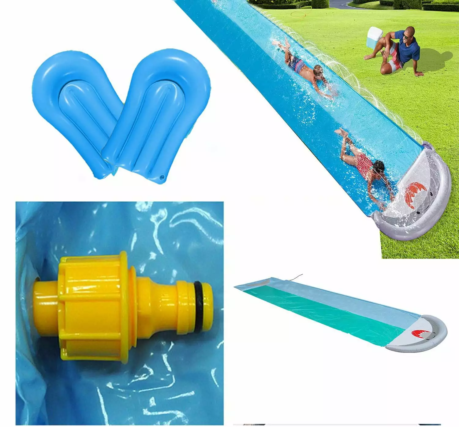 HIGH QUALITY. Made of thick and heavy-duty PVC with thickness up to 0.5mm. featured with rip guards that will surely prevent the water slides from splitting! EASY TO SET UP. Carefully unroll the slide. secure the bumper and then secure the slide. wet the slide and connect the water. adjust the sprinklers’ direction and height to your liking Refreshing Summer Appearance. This high-quality water fun inflatable slide has sprinkler holes specifically built on middle to provide maximum wetness and maximum wheee! The incredible water coverage on this outdoor play will keep kids sliding quickly and eager to enjoy the water fun. Water Slides and 2 Bodyboards. Lawn Water Slide Summer Slip Waterslides Water Toy with Build in Sprinkler for Backyard Outdoor Water Fun for Kids