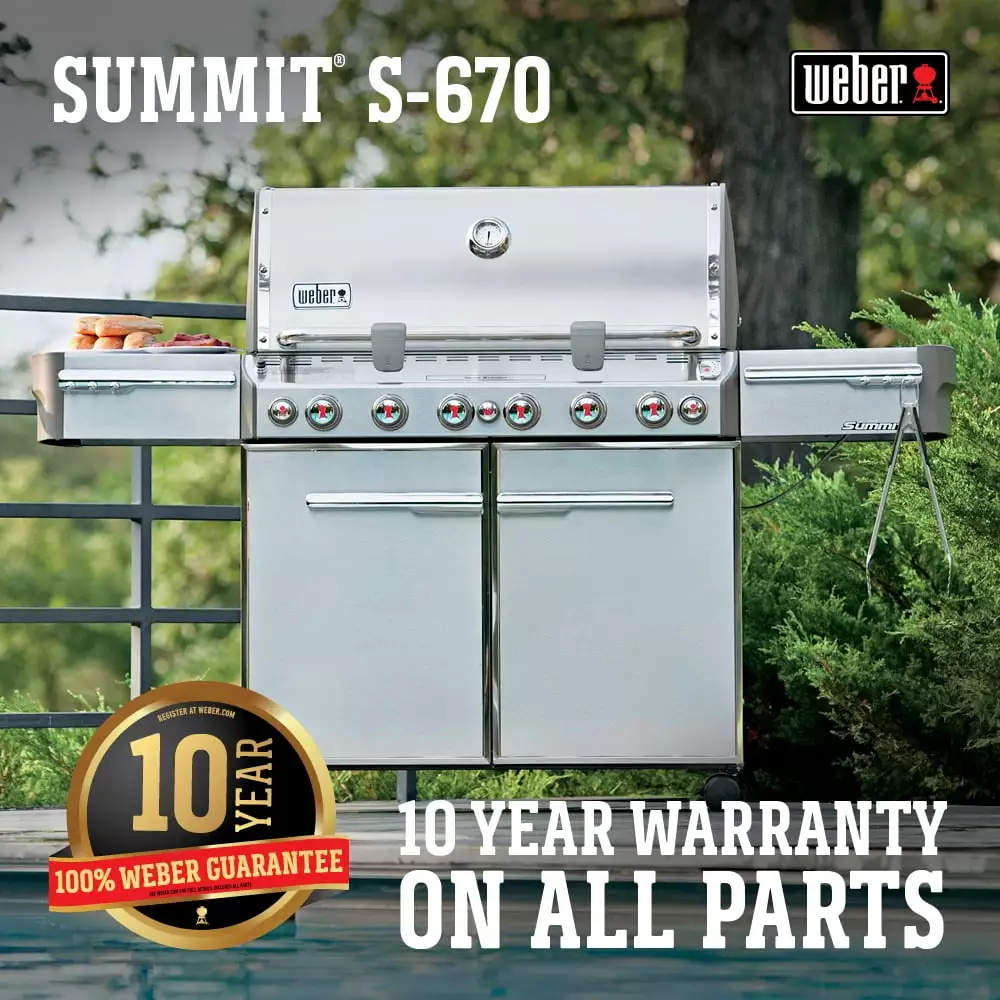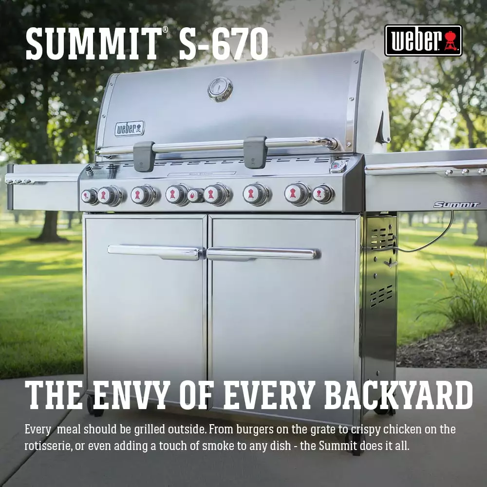 The Weber Summit S-670 6-Burner Gas Grill has 60.000 BTU main burners. a 12.000 BTU flush-mounted side burner. a 10.600 BTU Sear Station burner. a 6.800 BTU smoker burner. a stainless steel smoker box and a 10.600 BTU rear-mounted. infrared rotisserie burner. This grill features a Tuck-Away rotisserie system with flip-up motor and separate spit and fork storage in the enclosed cart. and a Snap-Jet individual burner ignition system.