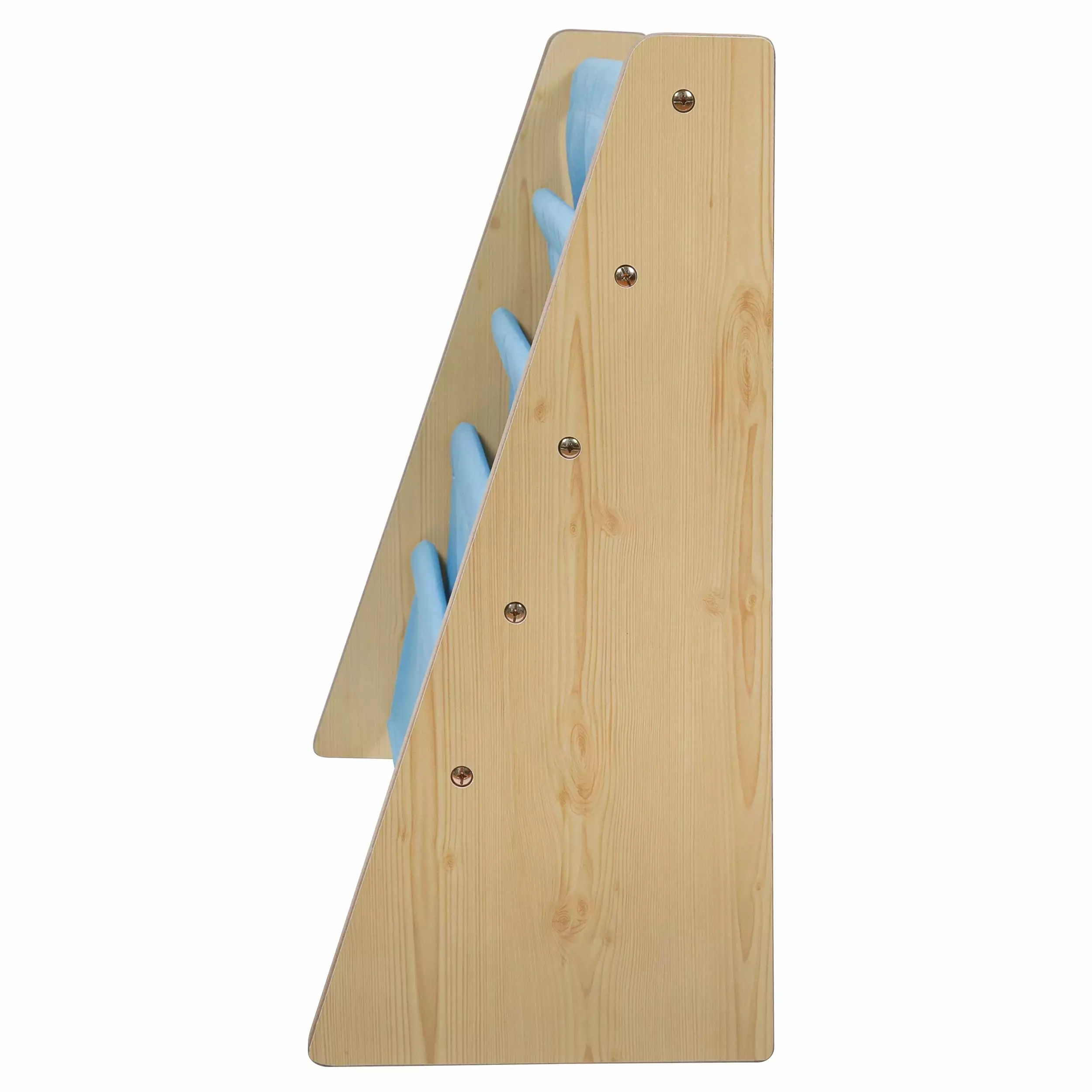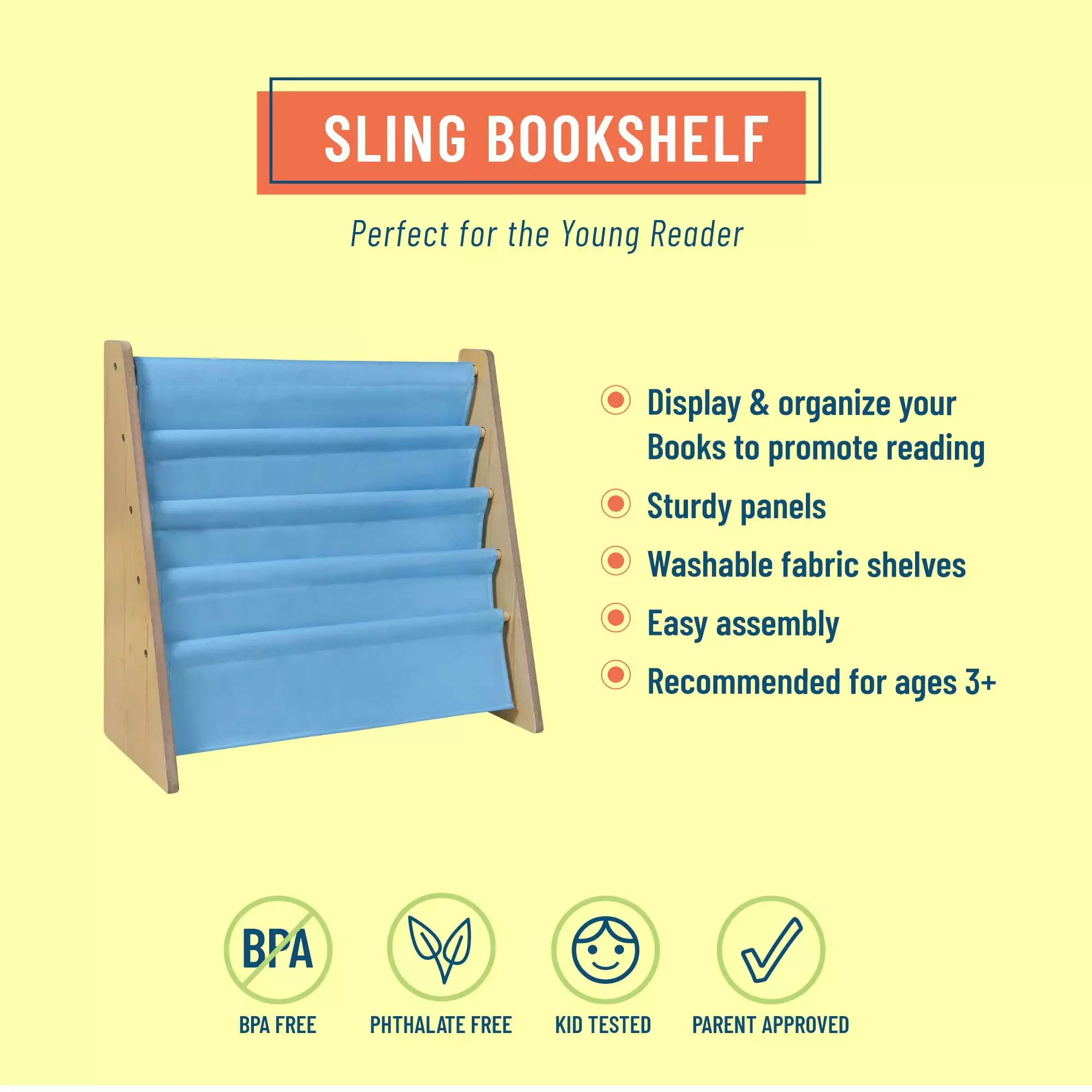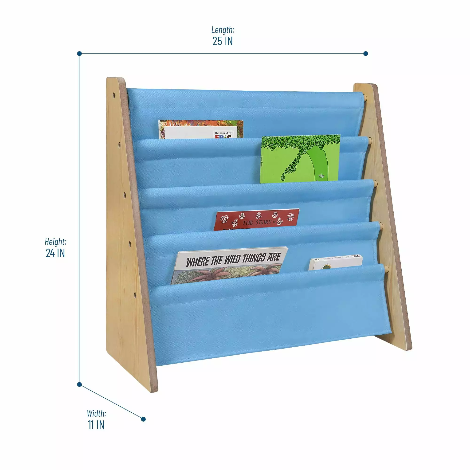 The Wildkin Sling Bookshelf is the perfect addition to any room! The sturdy wood bookrack with fabric pockets displays books for easy recognition by young children. encouraging them to read and then return their books for a neat and organized room. This bookshelf measures 25 x 24 x11 inches. Some assembly is required.