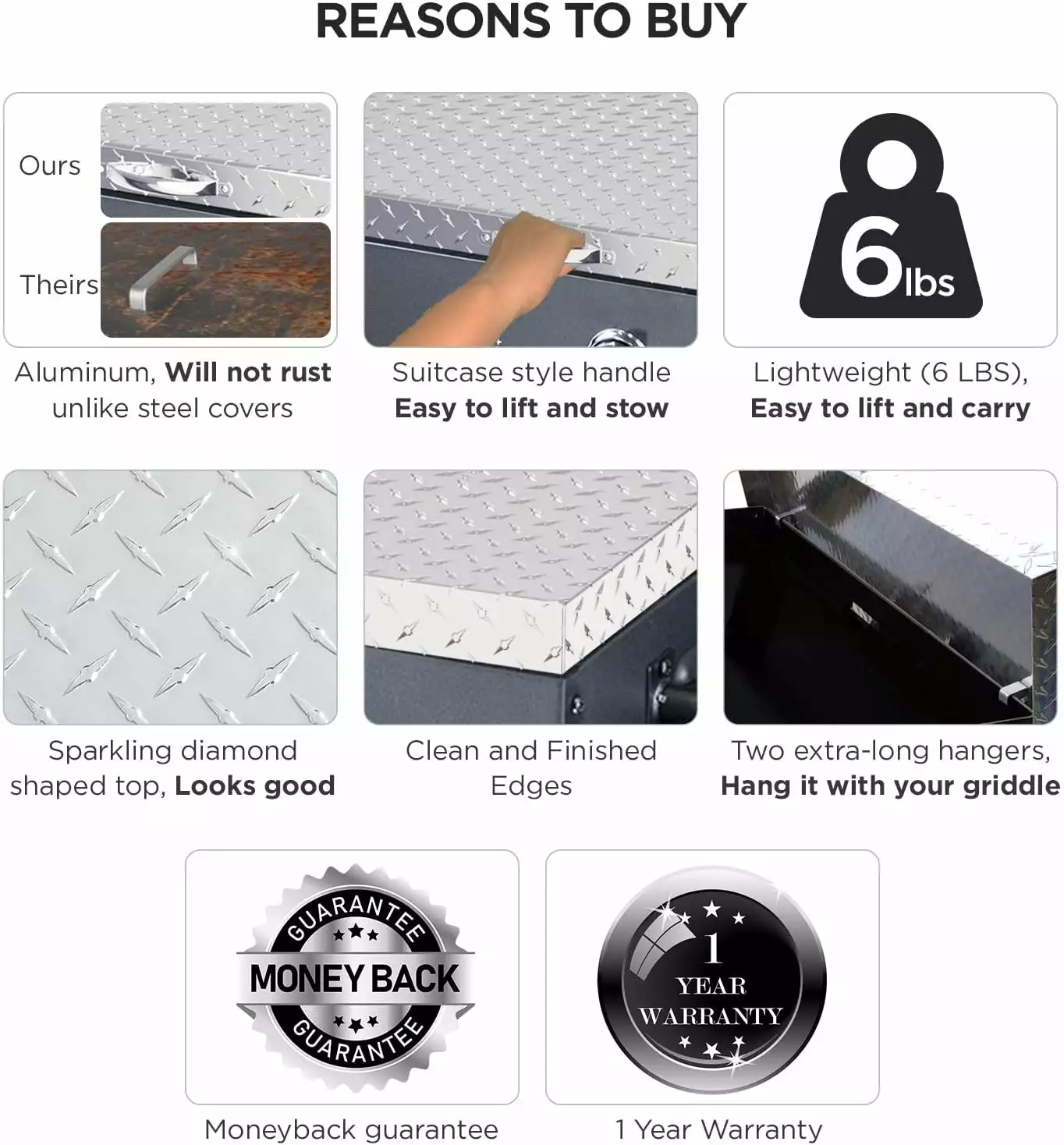 - LIGHTWEIGHT. 2-FINGER LIFT! Lightest weighing aluminum griddle cover in the market at 6 lbs compared with 15 lbs of other brands. Lift your cover with just 2 fingers!