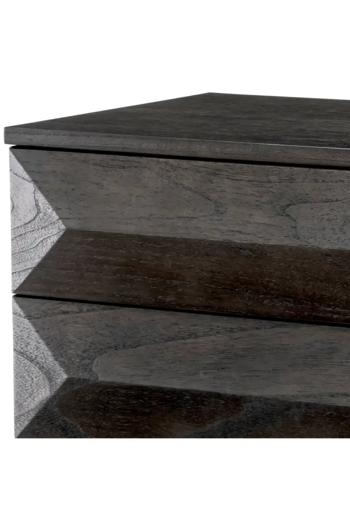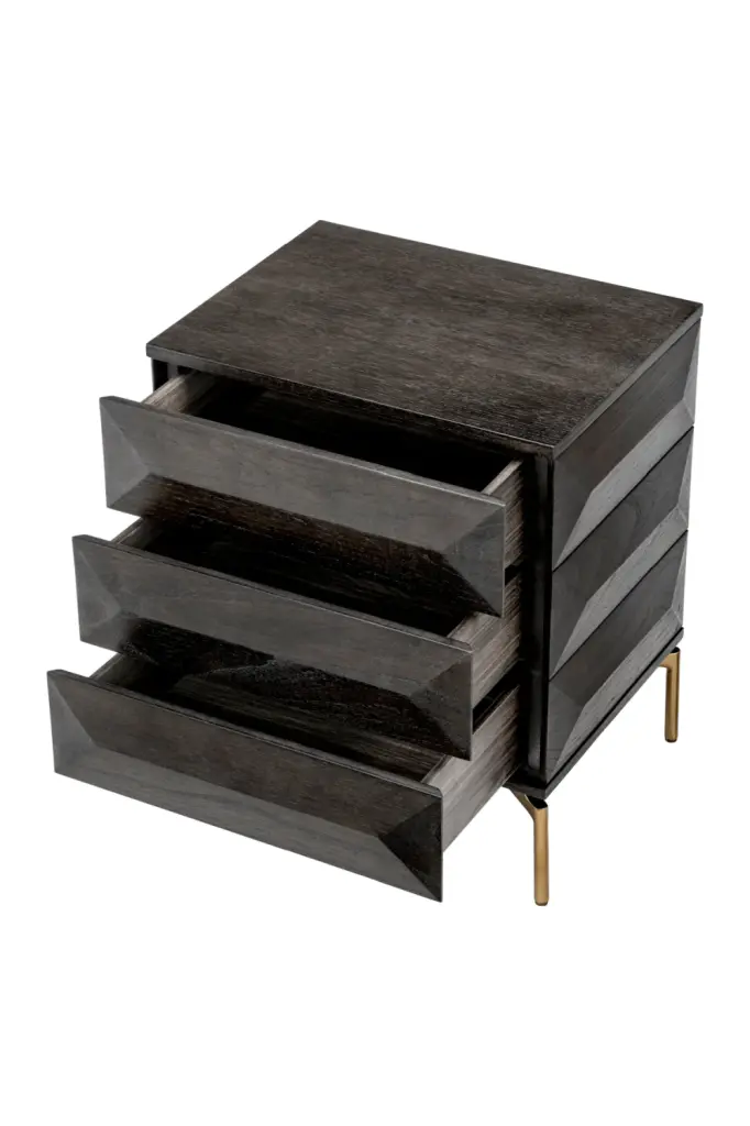 An elegant contemporary piece, the Denver Bedside Table by Eichholtz features wooden beveled fronts in a mocha finish and sleek brushed brass finished legs. It offers 3 drawers where you can store your bedtime essentials. The timeless style of Denver will instantly add elegance to any bedroom.