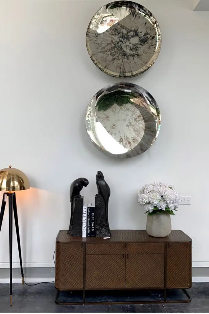 Pairing Bauhaus style with a Mid-Century Modern look, the Napa Valley Dresser showcases a sleek stainless steel frame. It is lined with woven oak veneer and contains 4 doors and a drawer with stainless steel handle.