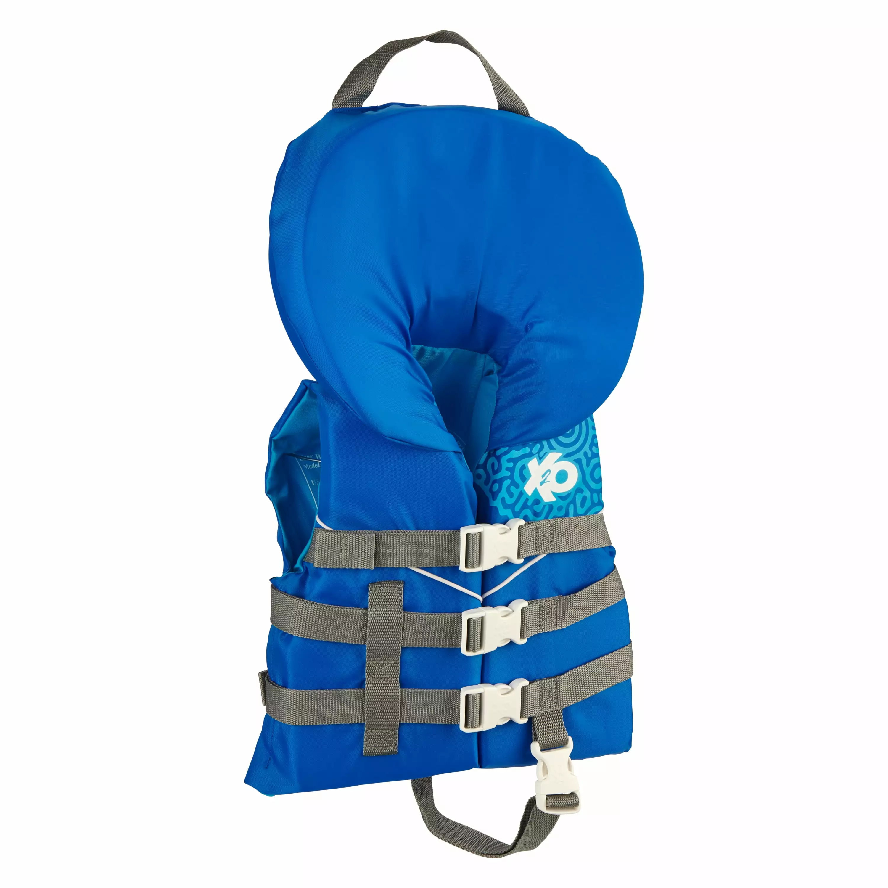 With the X2O Infant Life Vestin blue. even the littlest of the family can safely enjoy a day on the water! This U.S. Coast Guard approved life vest is designed to snuggly and comfortably fit your littlest one under 30 lbs. The three encircling body straps can be adjusted for a secure fit and the between-the-leg strap helps to keep the vest from riding up for added safety. The bright. colorful design increases visibility on the water. The back headrest provides excellent head support. and a top grab handle allows for quick and easy recovery out of the water. The X2O Infant Life Vest is a great choice for families seeking fun in the sun and on the water!