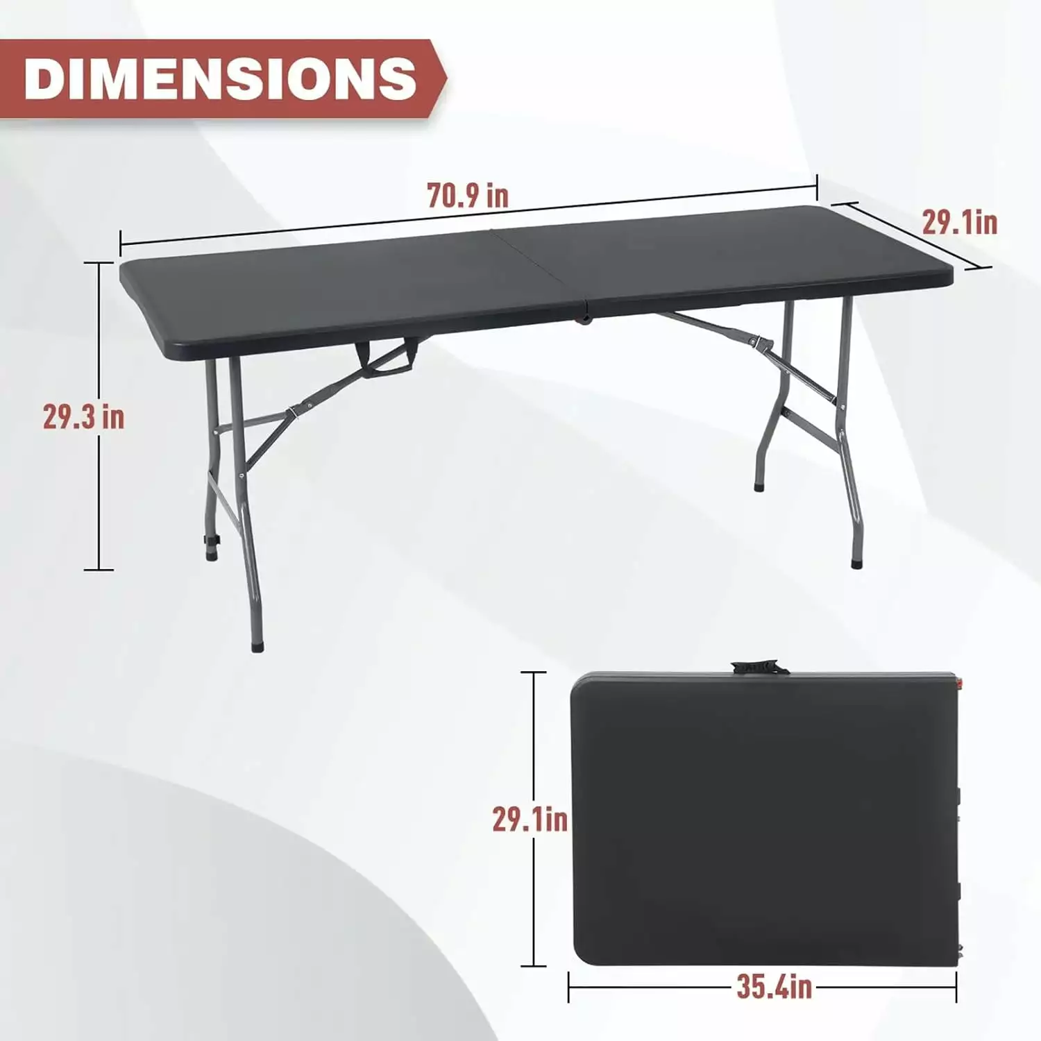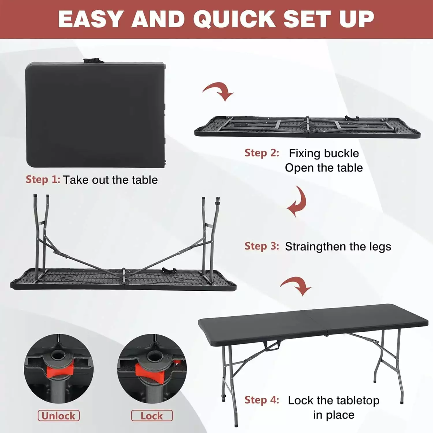 - Foldable This folding table 6ft can be folded in the middle and fastened with a safety catch for easy storage. You can put the folding table away in the trunk of your car. or in a small corner. and easily pick it up when you need it. camping tables that fold up lightweight.