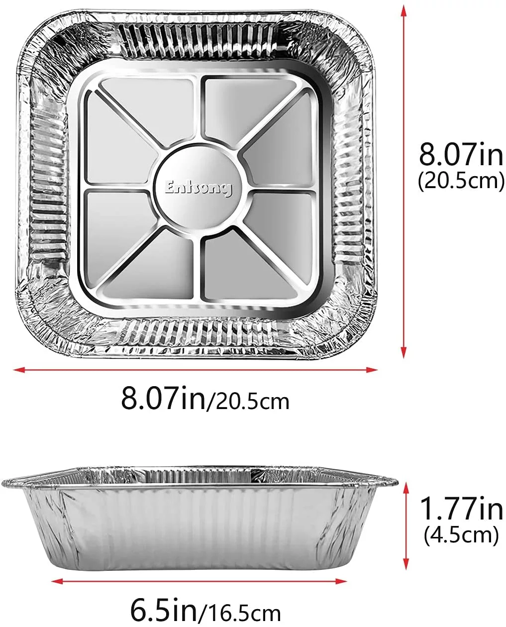 - TIN FOIL 8-INCH SQUARE BAKING PAN – Top 8.07x 8.07. Bottom 6.5x 6.5. High 1.77. This package contains 24 PCS cooking foil pans.