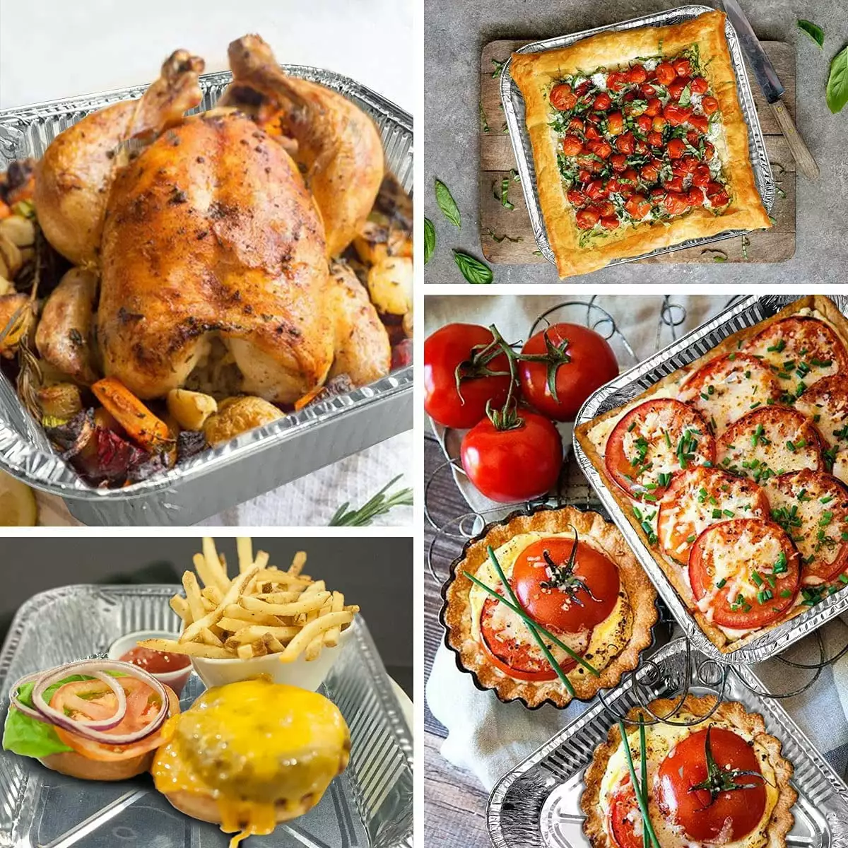 - ALUMINUM FOIL CONTAINER – Make big meals with little clean up in a disposable aluminum bake ware pan. Use foil roasting pans for baking cakes/oven frying chicken/etc along with veggies. potatoes. Carry hearty meals from the oven to the table.