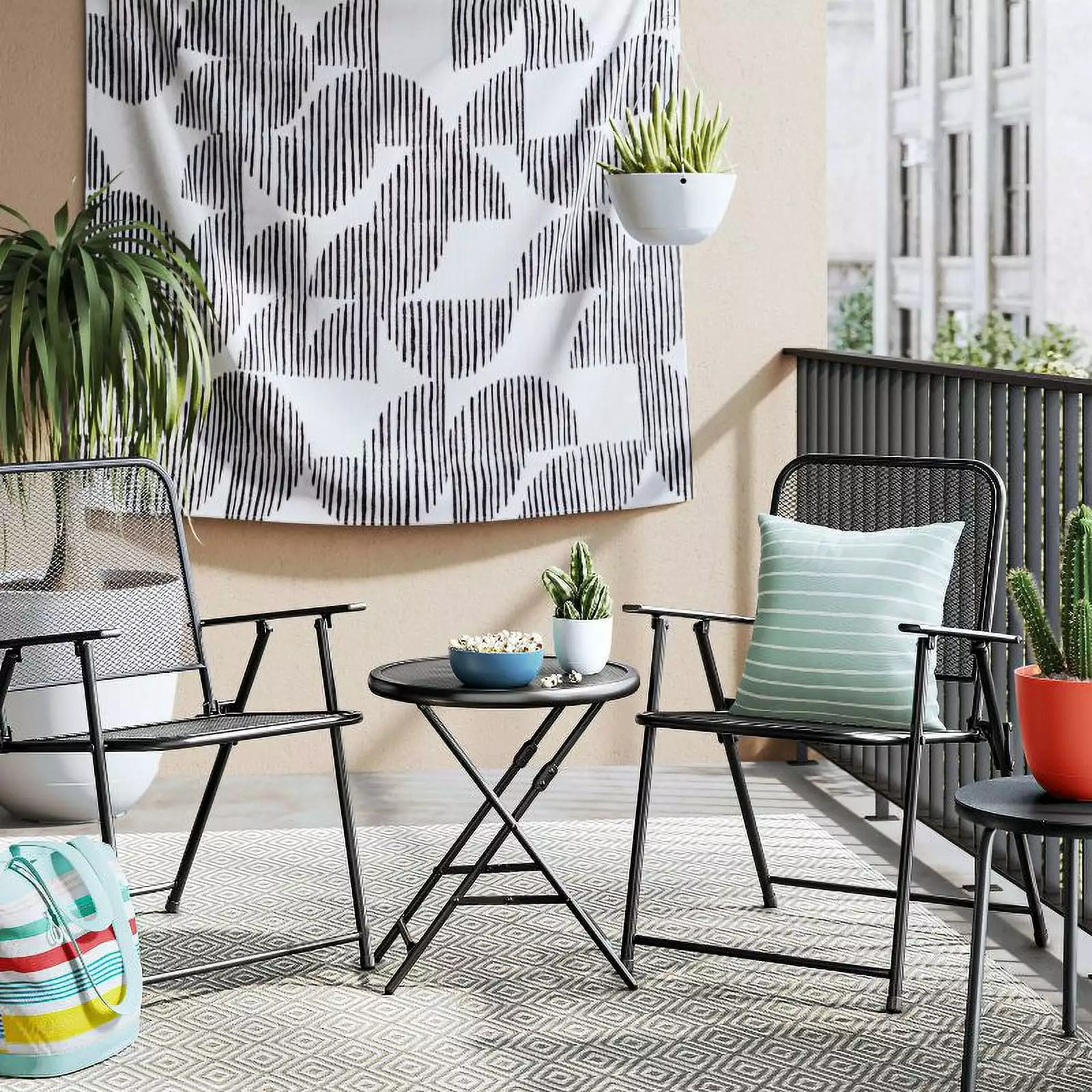 Whether you’re saving space on a small patio or just looking for convenient seasonal furniture with compact storage. this 18-Inch Steel Mesh Patio Folding Table makes a versatile addition to your outdoor furniture. Designed with a steel frame in a rust-resistant black finish. this folding patio table pairs easily with a variety of chairs and other outdoor furnishings and decor. The 20-inch height and 18-inch mesh tabletop diameter provide a convenient footprint for serving drinks and snacks for one or two people or simply perching decorative items like a potted plant or outdoor lantern. Plus. the folding design makes this steel patio table easy to store away between uses or over the winter.