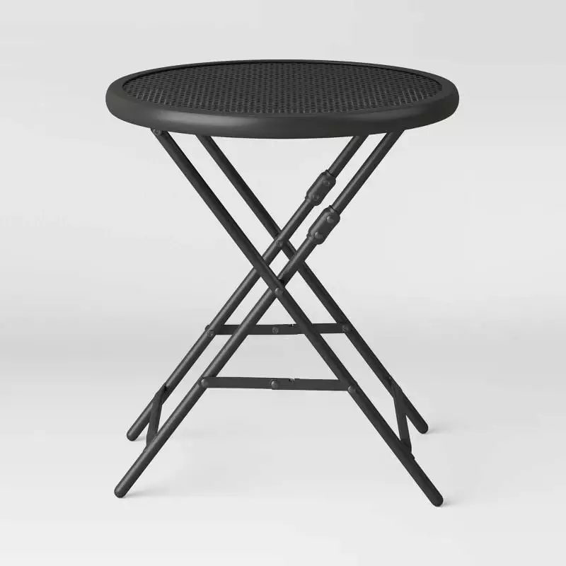 Whether you’re saving space on a small patio or just looking for convenient seasonal furniture with compact storage. this 18-Inch Steel Mesh Patio Folding Table makes a versatile addition to your outdoor furniture. Designed with a steel frame in a rust-resistant black finish. this folding patio table pairs easily with a variety of chairs and other outdoor furnishings and decor. The 20-inch height and 18-inch mesh tabletop diameter provide a convenient footprint for serving drinks and snacks for one or two people or simply perching decorative items like a potted plant or outdoor lantern. Plus. the folding design makes this steel patio table easy to store away between uses or over the winter.