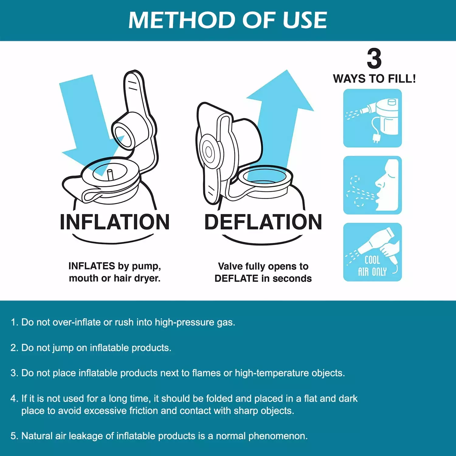 3 large quick inflation ports on the rainbow hair. neck and tail for quick inflation and deflation. Easy to store and carry.