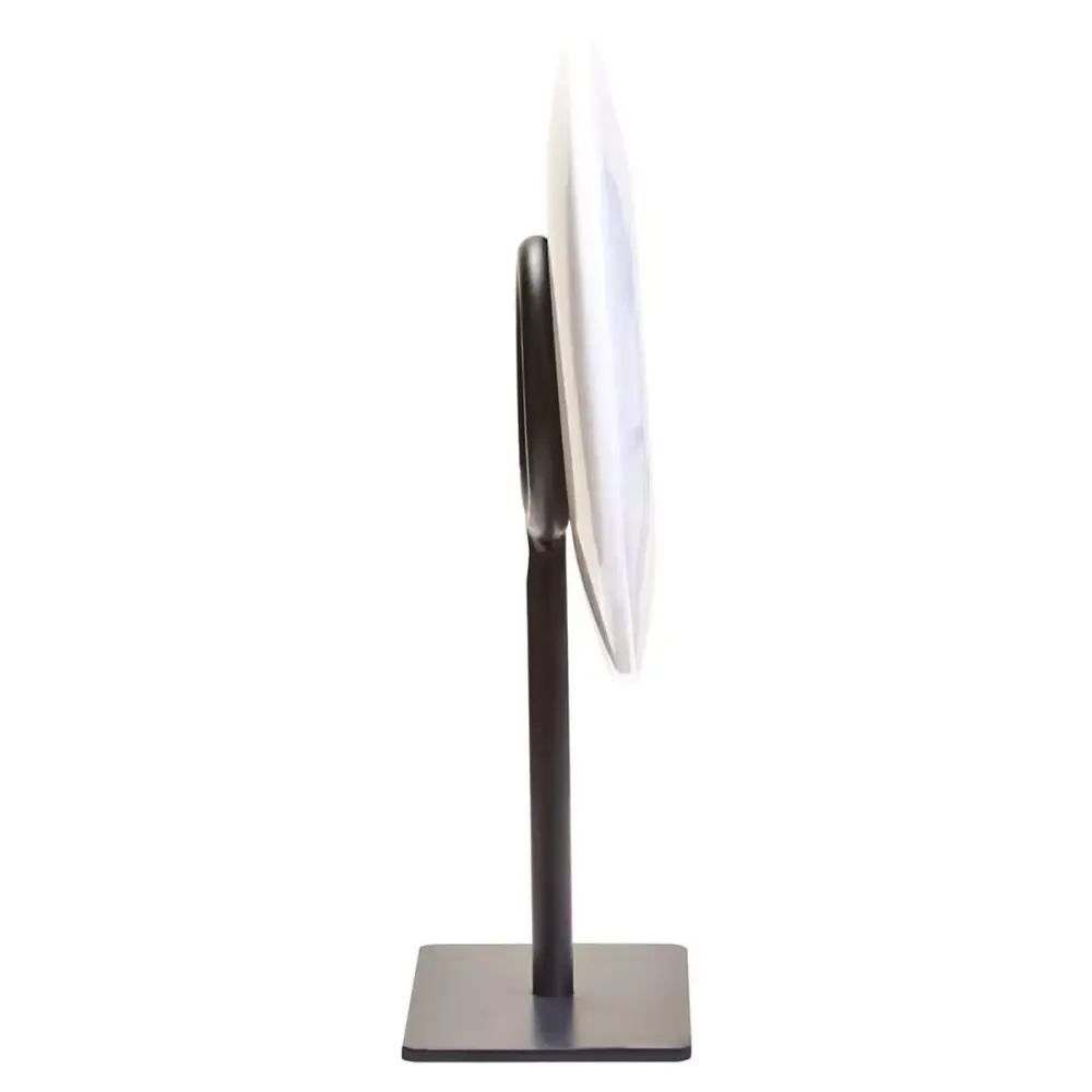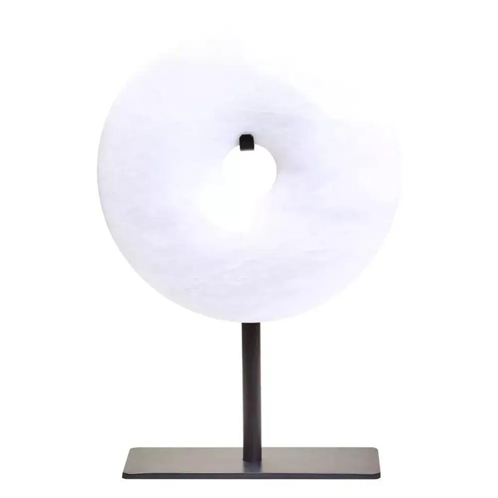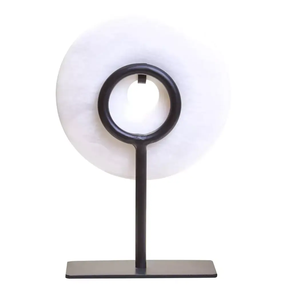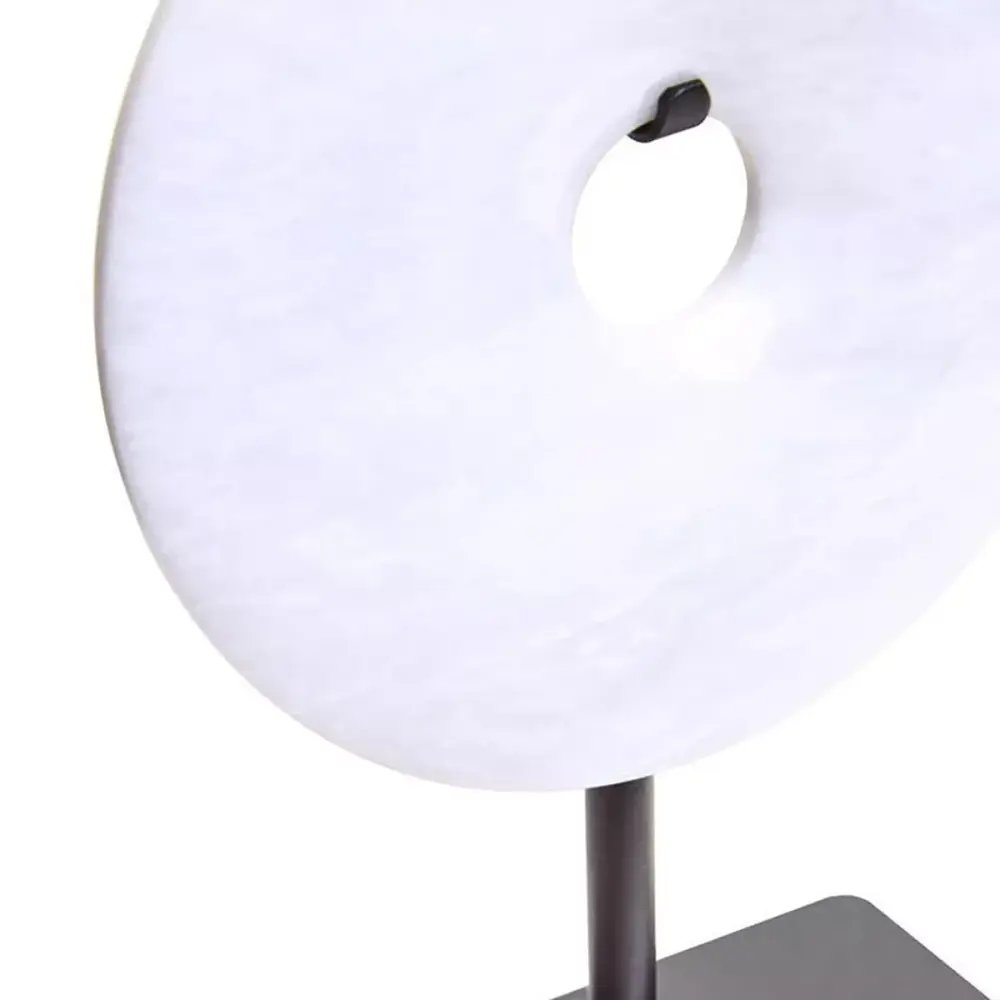 This timeless sculpture features a smooth, round white marble disc with the distinctive natural veining highlighted by a glossy finish. The sculpture is gracefully displayed on a contemporary black metal stand, offering a clean and pared-down aesthetic.